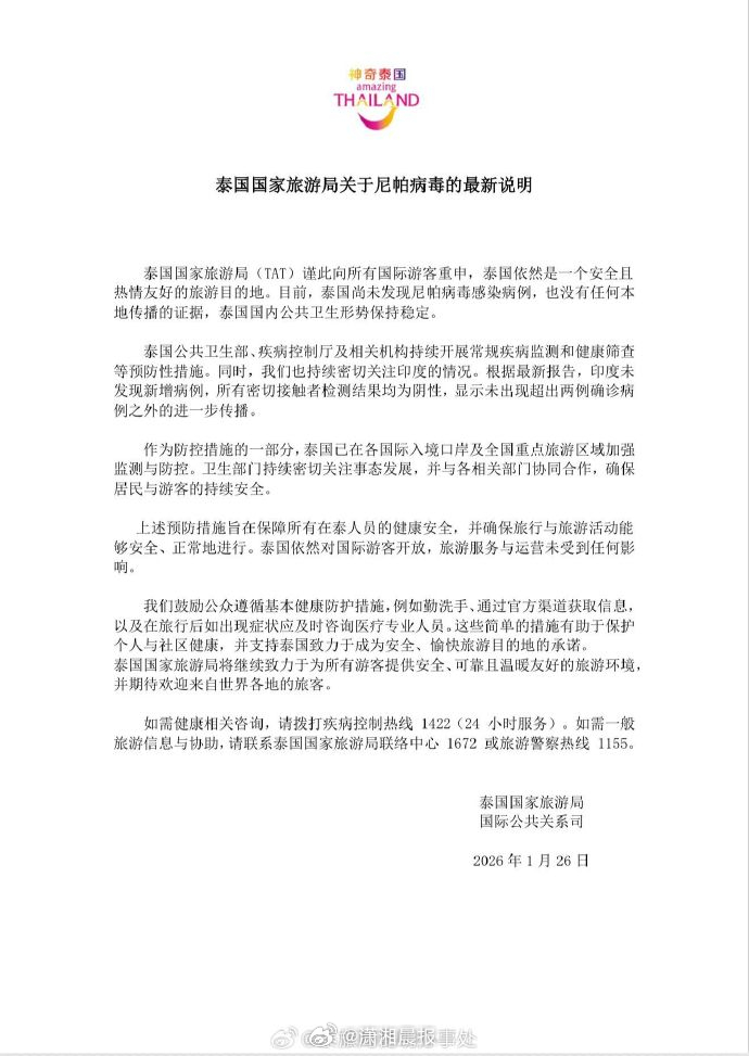 #泰国回应印度尼帕疫情#【#泰国尚未发现尼帕病毒感染病例#】1月27日,泰国国家旅游局发布关于尼帕病毒的最新说明:泰国国家旅游局(TAT)谨此向所有国际游客重申,泰国依然是一个安全且热情友好的旅游目的地。目前,泰国尚未发现尼帕病毒感染病例,也没有任何本地传播的证据,泰国国内公共卫生形势保持稳定。#印度尼帕病毒疫情对我国影响较小#泰国公共卫生部、疾病控制厅及相关机构持续开展常规疾病监测和健康筛查等预防性措施。同时,我们也持续密切关注印度的情况。根据最新报告,印度未发现新增病例,所有密切接触者检测结果均为阴性,显示未出现超出两例确诊病例之外的进一步传播。作为防控措施的一部分,泰国已在各国际入境口岸及全国重点旅游区域加强监测与防控。卫生部门持续密切关注事态发展, 并与各相关部门协同合作,确保居民与游客的持续安全。上述预防措施旨在保障所有在泰人员的健康安全,并确保旅行与旅游活动能够安全、正常地进行。泰国依然对国际游客开放,旅游服务与运营未受到任何影响。我们鼓励公众遵循基本健康防护措施,例如勤洗手、通过官方渠道获取信息,以及在旅行后如出现症状应及时咨询医疗专业人员。这些简单的措施有助于保护个人与社区健康,并支持泰国致力于成为安全、愉快旅游目的地的承诺。泰国国家旅游局将继续致力于为所有游客提供安全、可靠且温暖友好的旅游环境,并期待欢迎来自世界各地的旅客。如需健康相关咨询,请拨打疾病控制热线1422(24小时服务)。如需一般旅游信息与协助,请联系泰国国家旅游局联络中心1672或旅游警察热线1155。