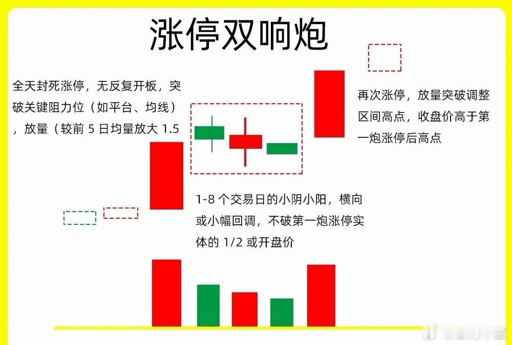 注意!短期强势形态里,涨停双响炮是最经典的K线组合,不少人听过却未必吃透,这个形态藏着主力试盘、洗盘的核心逻辑,想弄懂背后的操盘思路,这份内容一定要认真看!老规矩,点赞收藏+评论888支持一波,哟每天分享炒股干货,方便后续温习不迷路~涨停双响炮核心形态要点1. 出现位置:股价低位震荡阶段,或上涨趋势中的空中加油阶段,60日、120日等大周期均线均在股价下方形成支撑。2. 首板启动:股价拉出首个涨停板,全程无炸板回落,突破上方重要压力位且成交量明显放量。这是主力试盘动作,测试上方抛压的同时吸引市场关注。3. 炮架洗盘:首板后股价横盘整理或小幅回调,此为炮架形态。核心要求:回调时间不超8个交易日,成交量持续缩量,下跌幅度不跌破首板涨停板的一半位置。缩量回调是主力洗盘,清洗浮筹、抬高市场持仓成本,让后续筹码更稳定。4. 二板确认:洗盘后股价再度涨停,且成交量再次放量,标志主力洗盘结束,后续行情有望继续走强。这里重点提醒,第二个涨停板的再次放量是关键,缺一不可!以上就是涨停双响炮的核心内容,属于短线交易的基础知识点,一定要吃透。我们下期内容再见~