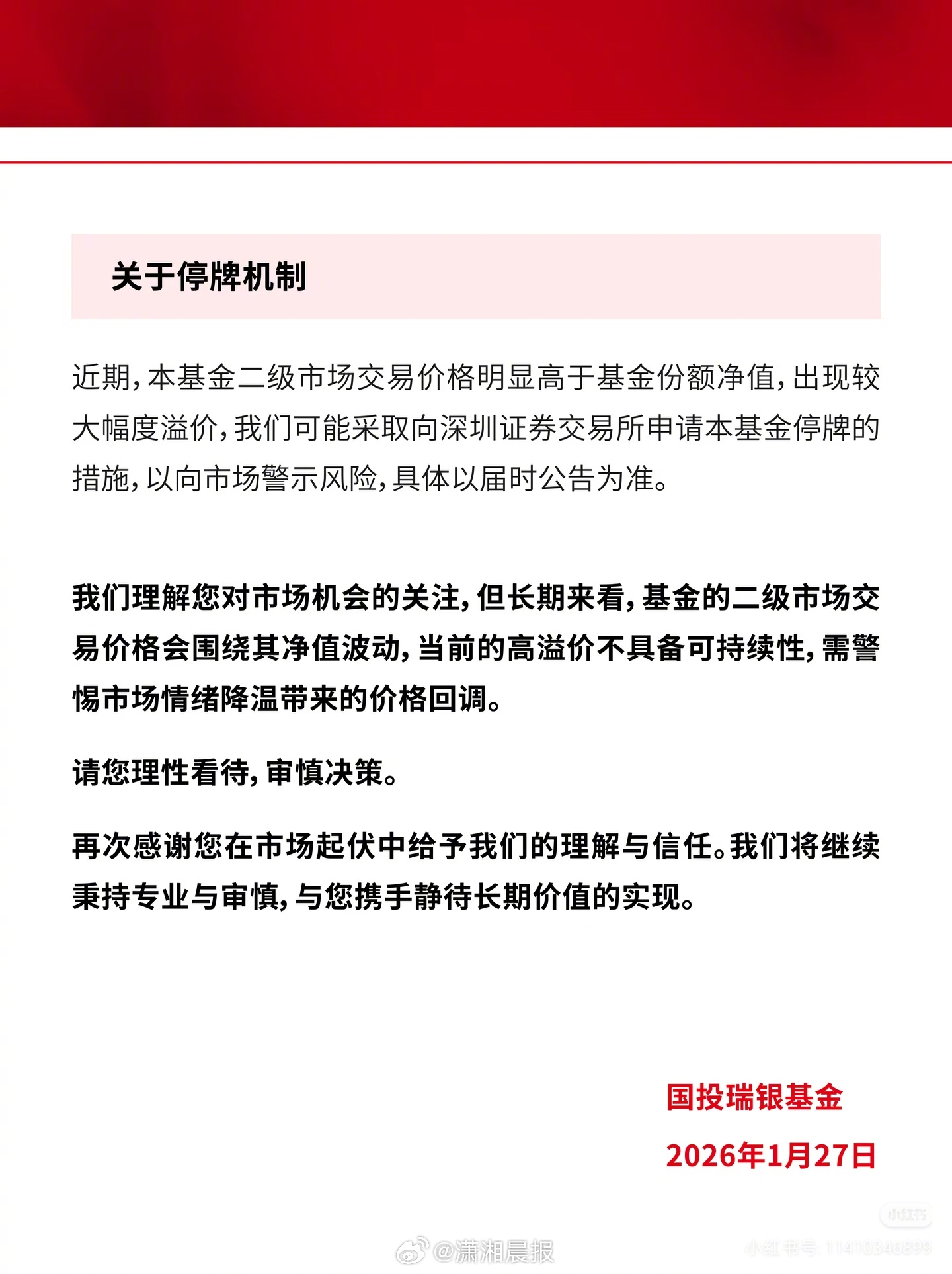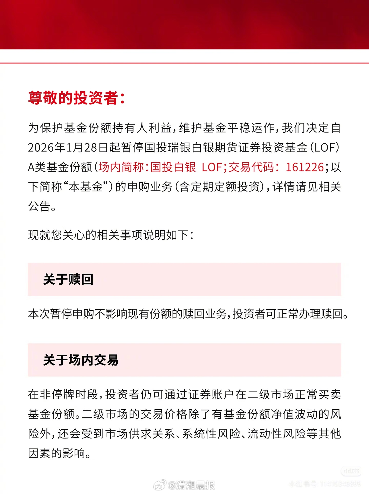 #国投瑞银回应白银暂停申购# 1月27日,国投瑞银发布关于白银LOF暂停申购业务的说明:为保护基金份额持有人利益,维护基金平稳运作,我们决定自2026年1月28日起暂停国投瑞银白银期货证券投资基金(LOF)A类基金份额(场内简称:国投白银 LOF;交易代码: 161226;以下简称“本基金”)的申购业务(含定期定额投资),详情请见相关公告。现就您关心的相关事项说明如下:关于赎回:本次暂停申购不影响现有份额的赎回业务,投资者可正常办理赎回。关于场内交易:在非停牌时段,投资者仍可通过证券账户在二级市场正常买卖基金份额。二级市场的交易价格除了有基金份额净值波动的风险外,还会受到市场供求关系、系统性风险、流动性风险等其他因素的影响。关于停牌机制:近期,本基金二级市场交易价格明显高于基金份额净值,出现较大幅度溢价,我们可能采取向深圳证券交易所申请本基金停牌的措施,以向市场警示风险,具体以届时公告为准。我们理解您对市场机会的关注,但长期来看,基金的二级市场交易价格会围绕其净值波动,当前的高溢价不具备可持续性,需警惕市场情绪降温带来的价格回调。请您理性看待,审慎决策。再次感谢您在市场起伏中给予我们的理解与信任。我们将继续秉持专业与审慎,与您携手静待长期价值的实现。