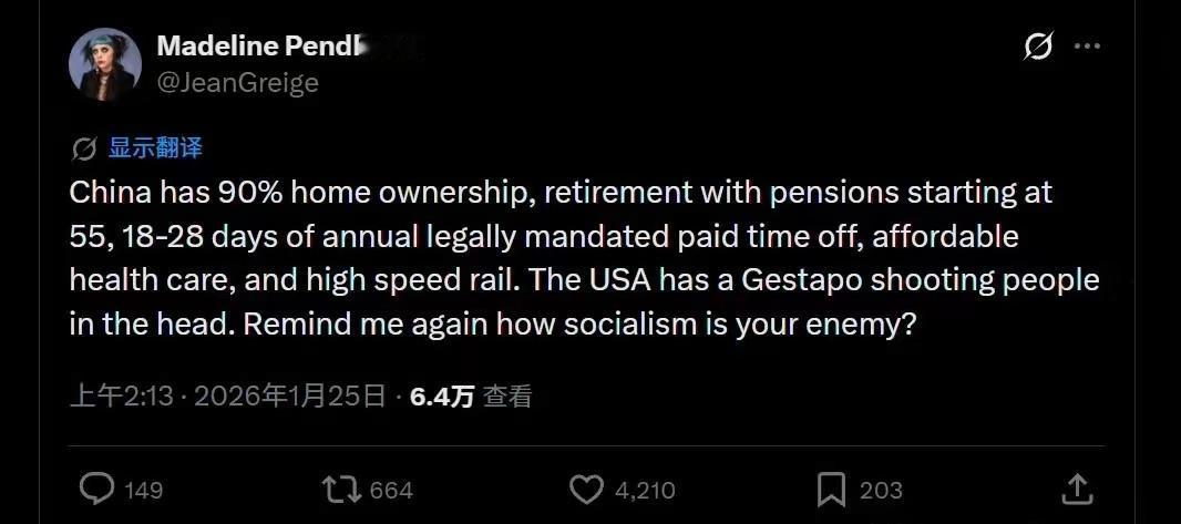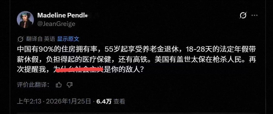 这届美国网友越来越羡慕我们了。 可惜黑命贵无法唤醒他们,路易吉·尼古拉斯的枪声无法改变医保的现状,“Good”和“Pretti”带来的仍然只是蜡烛、鲜花和满地狼藉。 该打两份工的还得打两份工,被斩杀线斩杀的依然在流浪。 拥有全世界最多私人枪支的国度,却不曾有所作为,难怪会被嘲笑说是“懦夫”。 大家讨论下,他们为何这么能忍呢?