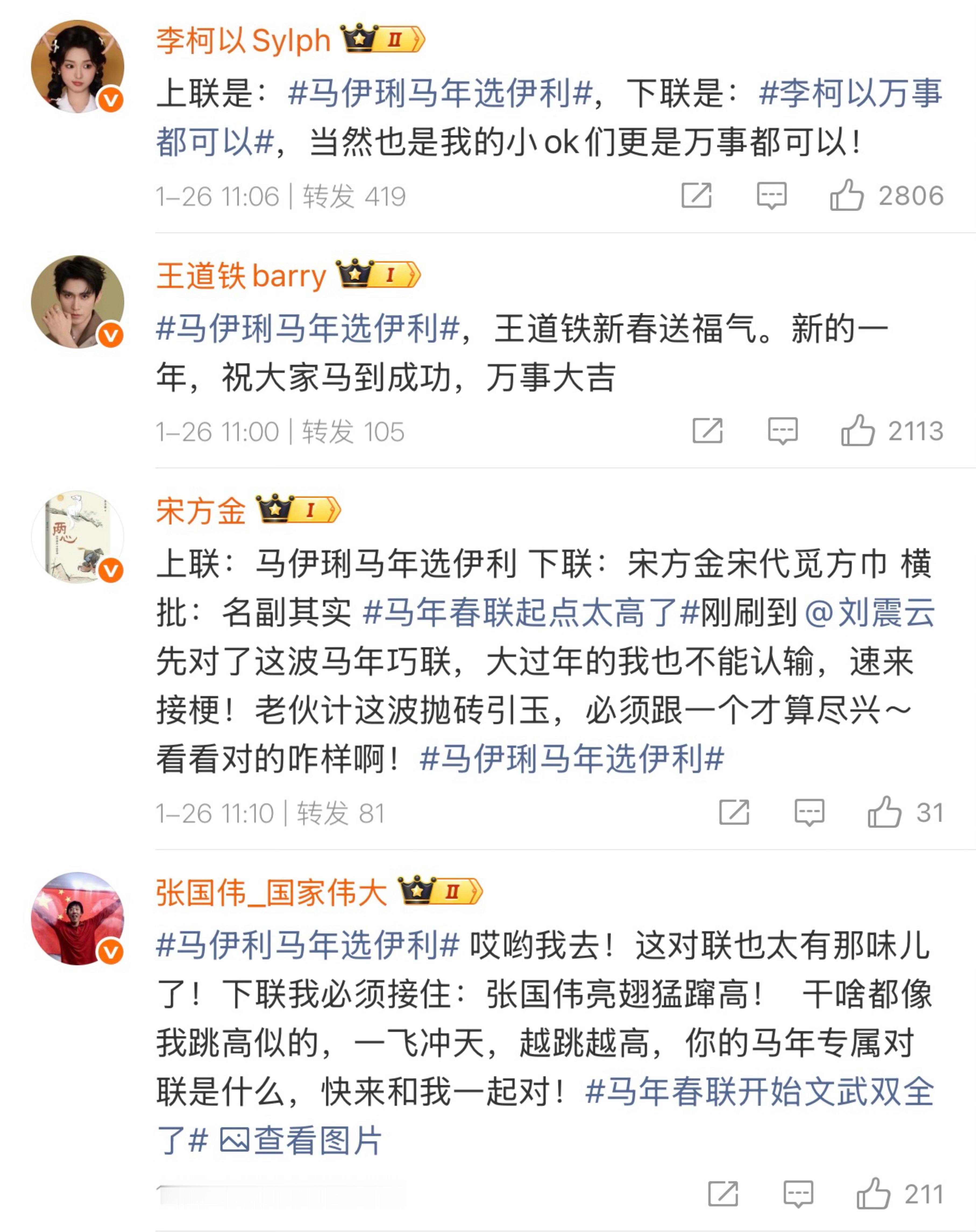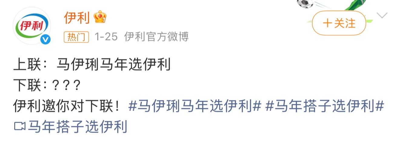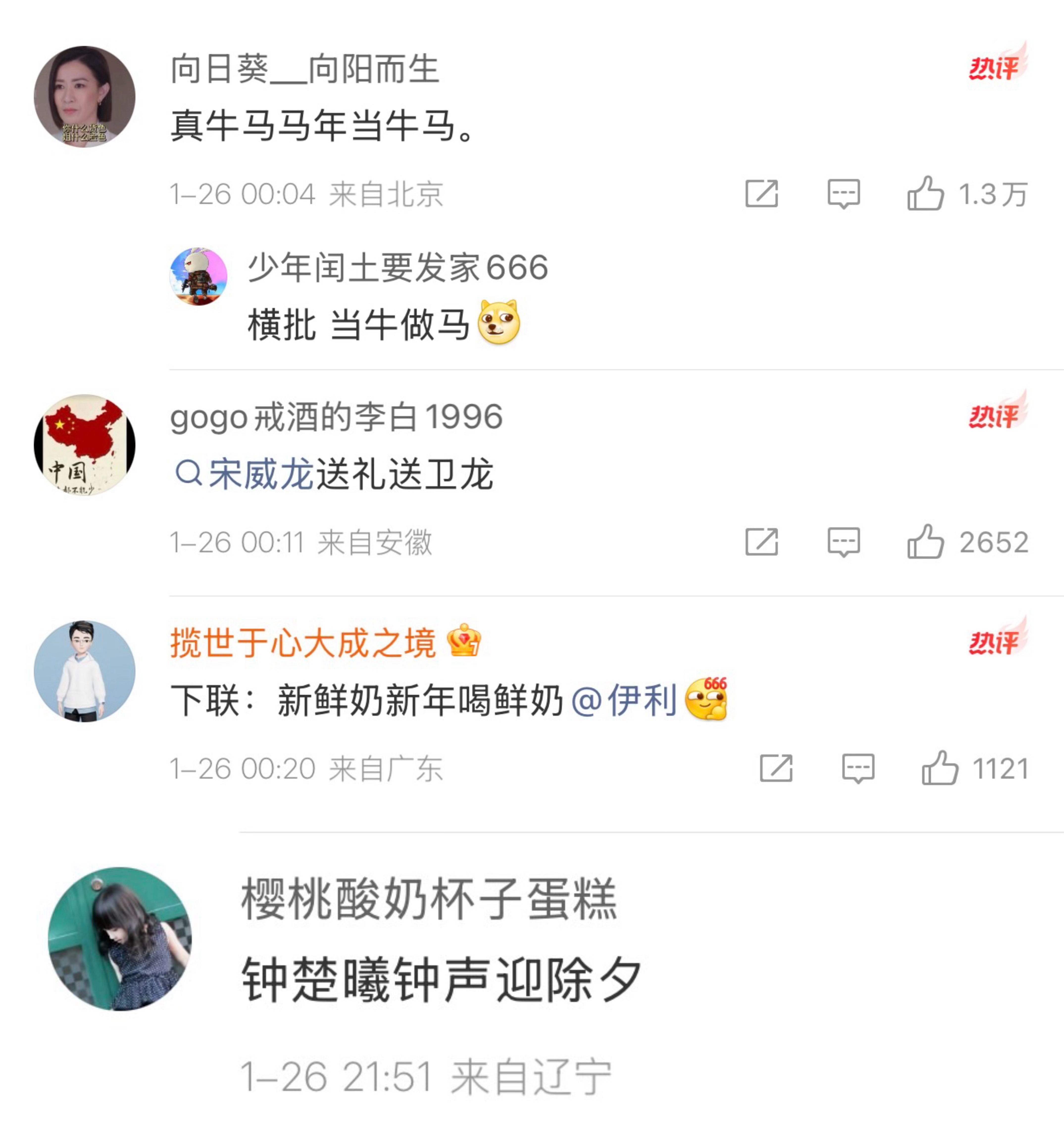 我真不行了,伊利是越来越抽象了!!牛爷爷之后是马思纯,马思纯之后来了马伊琍,谐音抽象梗已经开始人传人了,评论区已经炸出一堆文豪了,下一个不知道是哪位“牛”or“马”但是羊年的我想好了,我先提名杨幂和杨洋了,请务必采纳!伊利这个对联炸出来一堆当代文豪