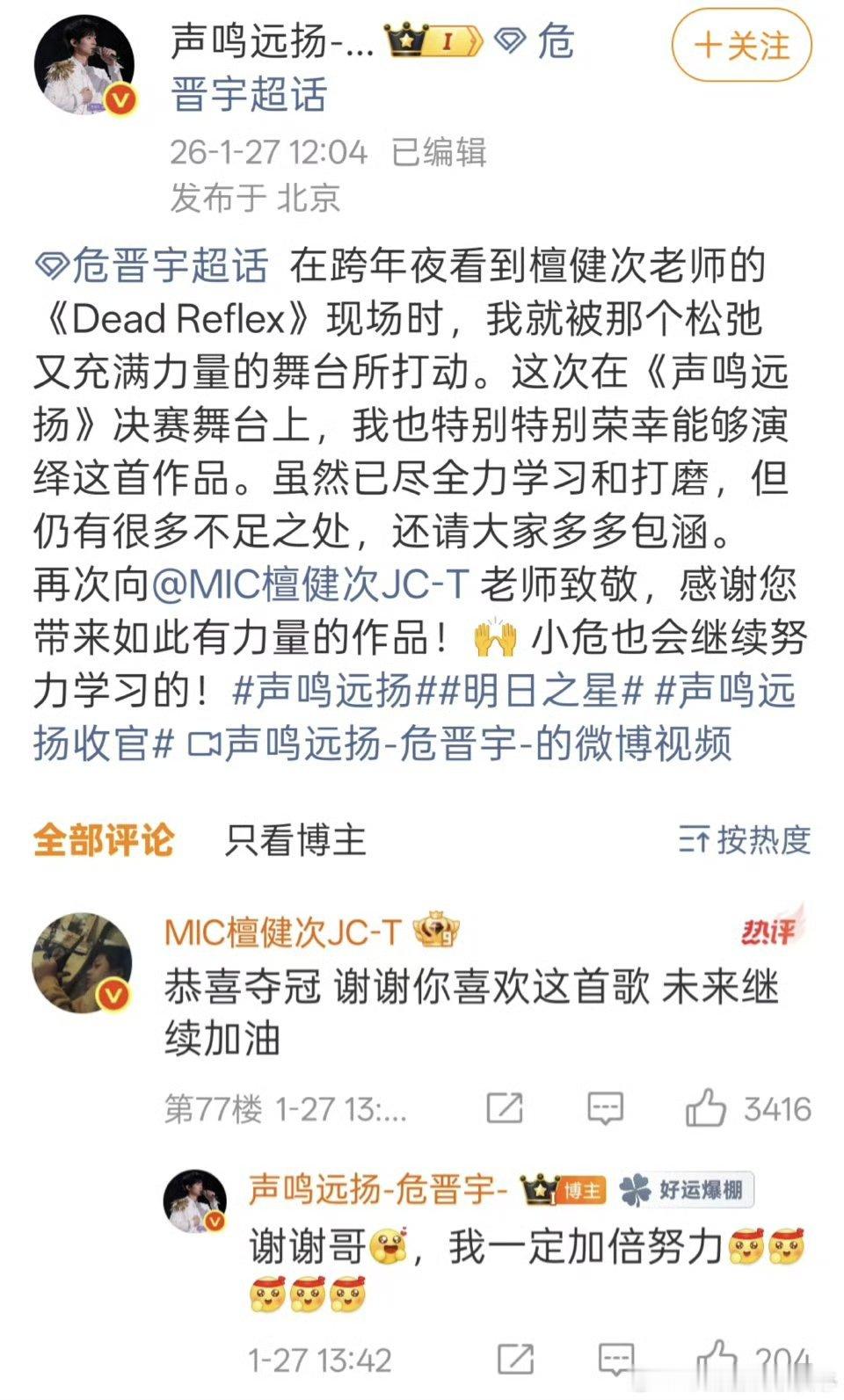 檀健次恭喜危晋宇获得总冠军危晋宇的冠军有檀健次一份功劳 危晋宇夺冠路,檀健次真是神助攻!新歌舞台两次助力,太强了!