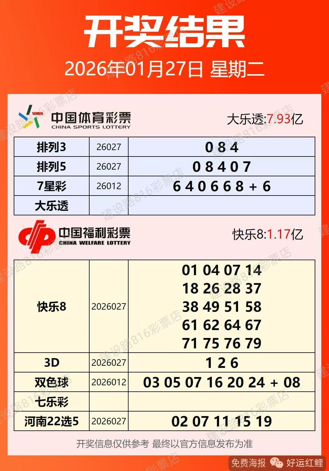 1月27号星期二,双色球开奖号码出炉:03、05、07、16、20、24—08。