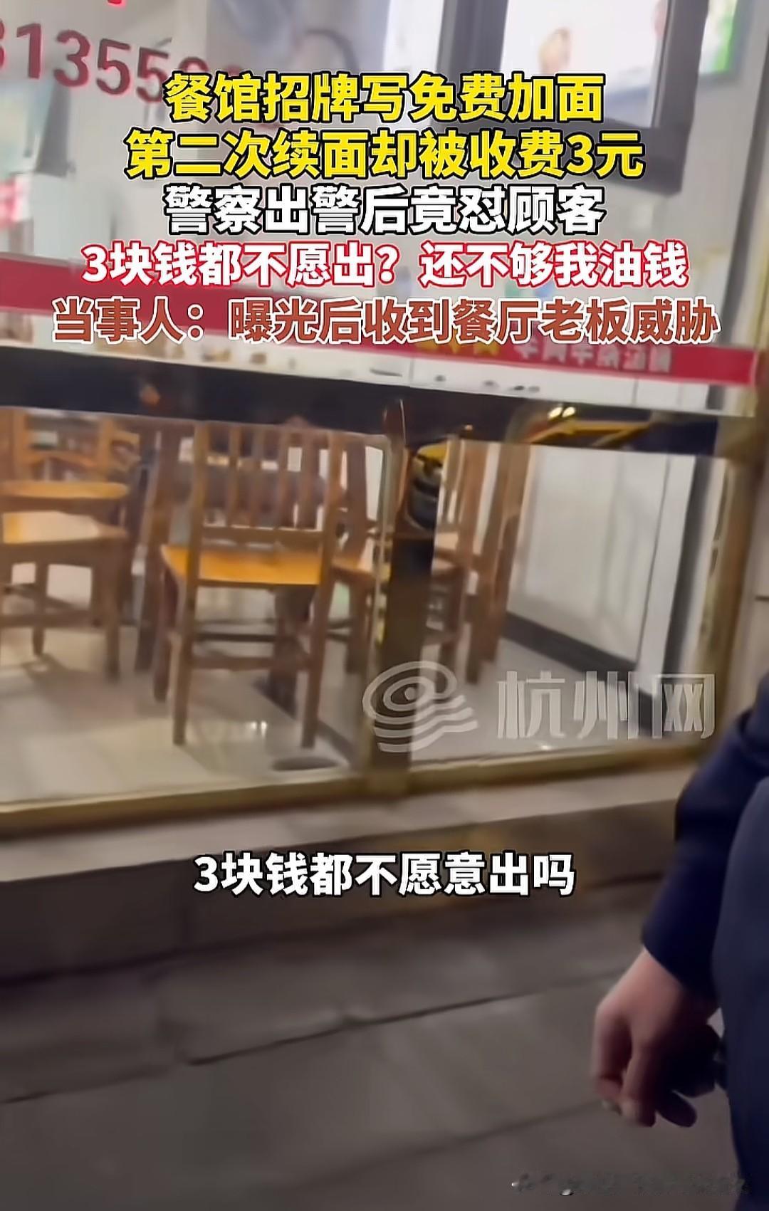 一夜之间乐山文旅天塌了!有游客在四川乐山续面被拒,和面馆老板起了争执,因为面馆招牌写有“免费加米线/加面”的字样。游客无奈报警,民警赶到后以为多大的事,不就3块钱再续一碗的事吗,把游客训了一顿,还抱怨来一趟还不够自己的油钱。游客扫兴离去,事后曝光还收到了面馆老板的威胁…… 游客和面馆老板起争执,并不是因为面馆能不能续面的问题,而是续几次的问题。第一次是免费续面的,这是很多老板能接受的。但是这位游客是第二次续面,这样一来老板就不乐意了,利润没了。免费续面,分一次和无限次,如果不写明,就默认了无限次,这次游客占上风。 再者就是民警的抱怨,确实废了油钱,浪费了公共资源,因为这件事不应该发生。哪怕老板有苦难言,顾客感同身受,都不会因为那几块钱大动干戈。如果顾客已经免费续面一次了,但又觉得本钱没吃回来,想继续续一次,如果你是老板,你会怎么做?是加钱,还是硬着头皮给顾客续面呢?