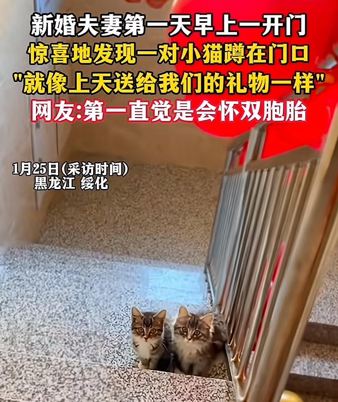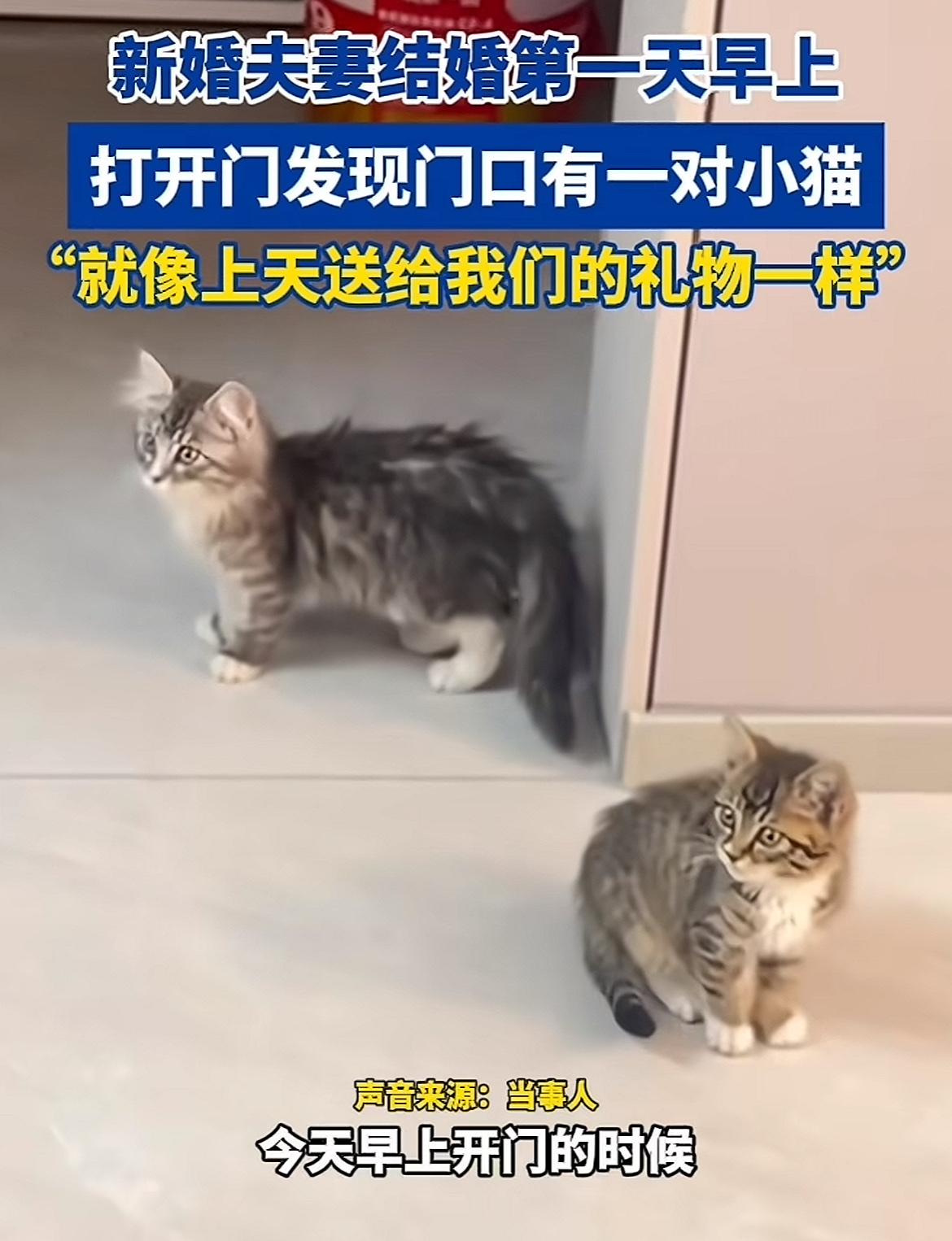 解释不清了!黑龙江绥化一对新人新婚清晨开门,竟撞见一对小猫乖乖蹲门口,零下30多度的天,小家伙们就这么成了上天送的新婚礼物,也太有缘分了!丈夫一拍手,小猫就熟门熟路进屋,女子记挂着它们,从10楼找到6楼,看着冻得发抖的小家伙,干脆直接收养,这波善意真的暖到心坎。 总说猫来财,成双成对的小猫主动登门,本就是满满的好兆头,但更珍贵的是新人这份藏在骨子里的温柔。在自己新婚的喜悦里,还能看见弱小生命的窘迫,愿意伸手给流浪的小生命一个家,这份善良才是婚姻里最珍贵的底色。 好的缘分从不是单向的奔赴,新人给了小猫温暖的港湾,小猫也用陪伴给婚姻添了甜蜜,这才是最美好的双向奔赴。你遇见过哪些小动物带来的暖心缘分?评论区唠唠~