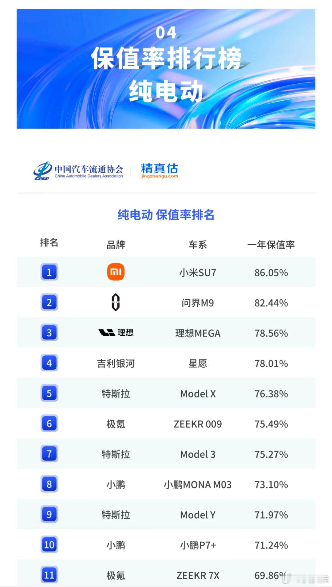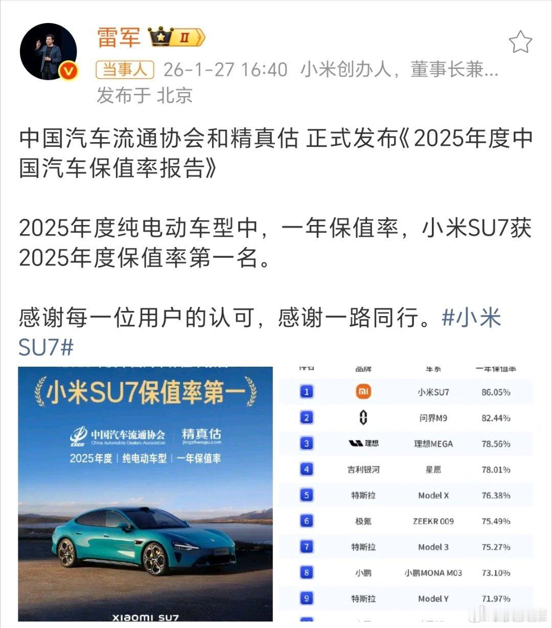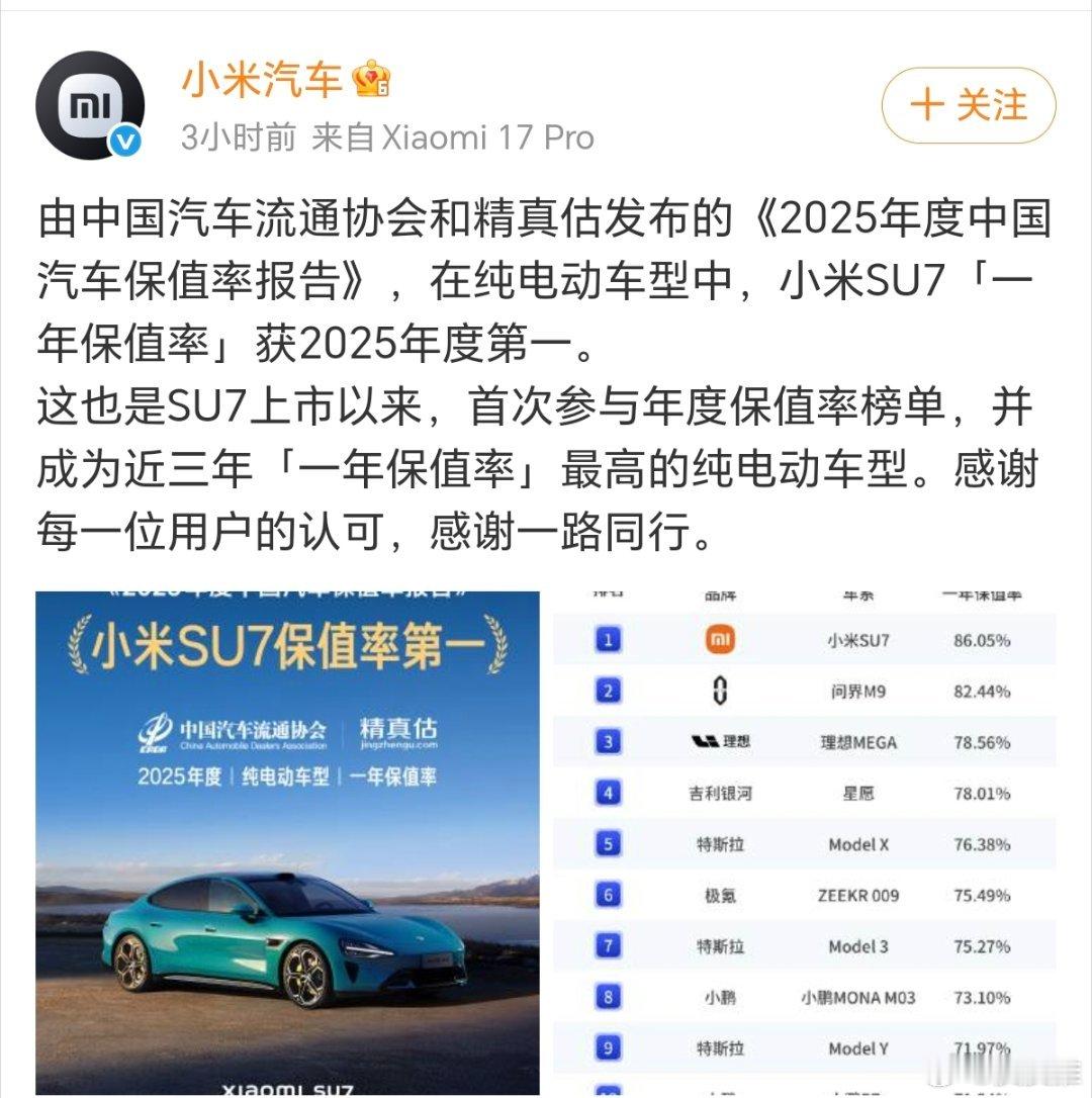 雷军回应小米SU7保值率第一名近日,中国汽车流通协会和精真估发布了《2025年度中国汽车保值率报告》。小米SU7荣获纯电动车型2025年保值率第一的好成绩。值得一提的是,小米SU7自上市以来,首次参与年度保值率榜单,并成为近三年“一年保值率”最高的纯电动车型。保值率意味着销量好、流通性好、备受用户喜爱,更重要的是产品好。对此,雷军专程发文回应这一喜讯,并感谢广大用户小米SU7的认可。我发现身边越来越多的朋友已经买了小米SU7。