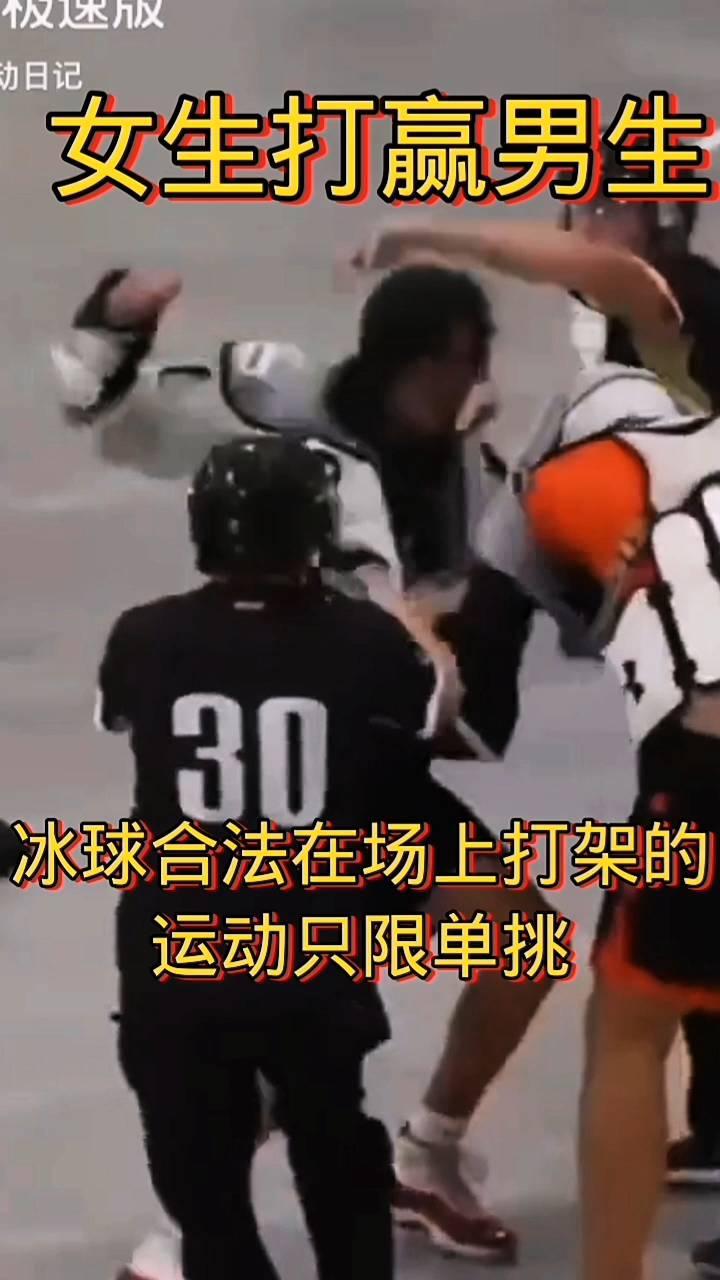 女生打赢男生,冰球合法在场上打架的,运动只限单挑。