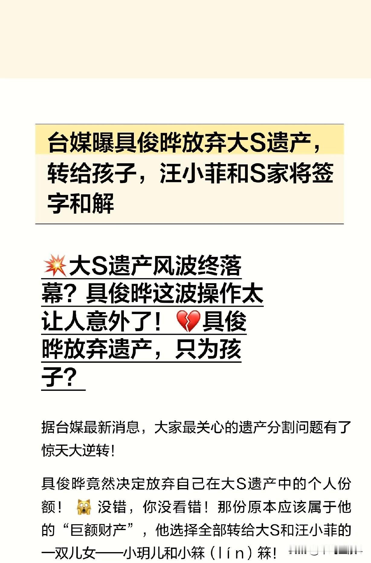 惊呆,要对具俊烨刮目相看了,台媒曝,具俊烨放弃了大S遗产,要将个人所得部分也转赠给孩子,汪小菲与S家也得到了和解,也就是说,具俊烨的这个举动,推动了s家和汪家的和解进度,让两家关系不那么紧张了。 之前那么多人说具俊烨不走是为了继承遗产,每天去墓地看大S是作秀,现在终于还自己清白了,大S没看错人,可惜造化弄人,不过,结局挺好,都是为了孩子,放下了过往恩怨。