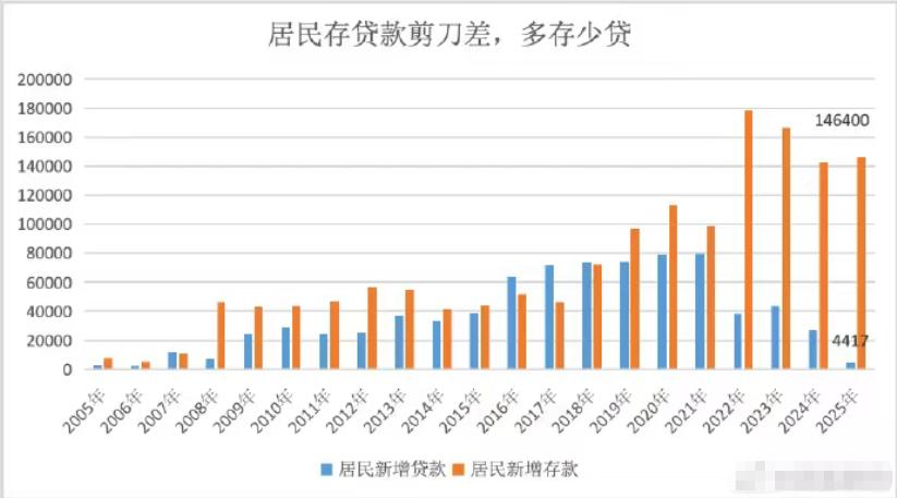 又是“被平均”的一年。 总感觉过去的2025年,是本人极其萎靡的一年。 近日,国新办发布会公布了去年全国存款和收入数据,全国居民人均可支配收入43377元,折算下来一个月三千多块,其中工资性收入为24555元。截至2025年底,全国老百姓的存款余额为167万亿元,算到每个人头上就是11.89万。 在座的各位网友,我说的是有一个算一个全部,有多少能拿出12万现金存款来的,大家亮亮相,让我死了这条心吧。如果是三口之家,那就得36万现金存款,反正我是拿不出,挣得还不够花得多,人到中年虽然没有房贷车贷,但是孩子上大学、父母养老……压力山大,喘不过气来,为啥你们存款一年一年创新高,我的口袋一年瘪似一年?就我不够努力吗?想不明白。 第一张图表是存贷款比较,可以很容易看到2022年-2025年,存款激增、贷款迅速萎缩,这说明大家避险情绪浓重,不敢花钱不敢投资不敢消费,都采取了王八不出头的龟缩战术,能苟一年是一年吧。