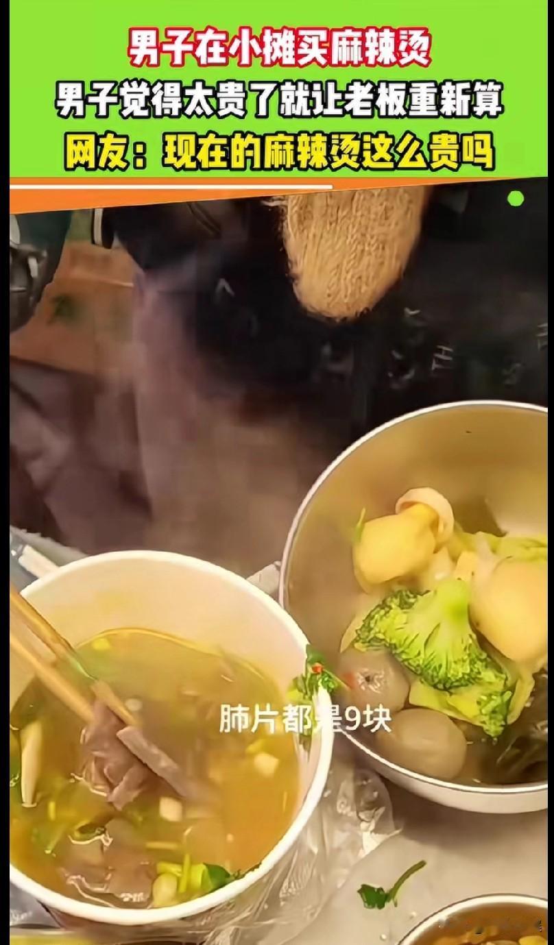 现在麻辣烫有点贵的离谱吧! 男子在小吃摊买了一份麻辣烫,但是感觉太贵了,就让老板重新算算价格,因此老板把麻辣烫中的菜一块块的夹到另一碗中,一块块的重新算下钱。 其中,一个丸子3元,3块菜花是2元,两块蘑菇是5元,一块肺片是3元,3块肺片就是9元……,这麻辣烫也太贵了吧。 3小块菜花就是2元,如果在菜市场2元都可以买一斤的菜花了。 最后夹的肺片,一小块就是3元,是最贵的;贵的离谱,猪的一整个肺也就5元,凭什么这里一片就是3元,而且猪肺不干净,好多都是给狗吃的。就像她这种卖法,一个猪肺都能卖上2千元,一个猪肺切个大几百片的。 这麻辣烫吃的太贵了,太心痛了! 以前觉得吃份麻辣烫算是便宜的,现在麻辣烫太贵了,要吃不起了,关键是一点都不划算。