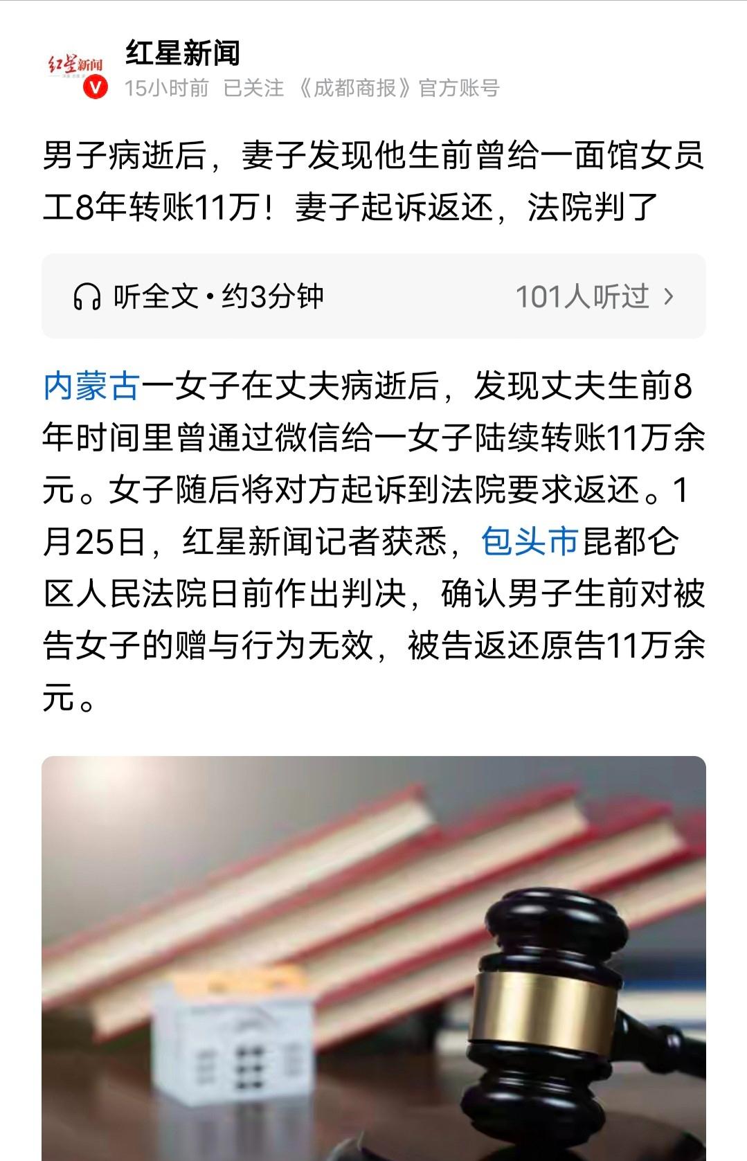 内蒙古,女子的丈夫病逝后,她收拾遗物发现丈夫在8年里给一面馆女员工转了117362元,她去找女员工要说法,女员工却说:他转钱给我,是让我帮他储值卡、买礼盒、买饭卡用,这钱我一分没拿,都是他消费了。见女员工死活不承认,女子一气之下告上法院。 2025年4月,郭女士还沉浸在丧夫的巨大悲痛中,丈夫王某走得太急,连句遗言都没留下,一想到这她眼泪就止不住的往下掉。 那些朝夕相处的日常片段总在脑海中盘旋,为了留住和丈夫相关的点滴回忆,郭女士开始慢慢整理丈夫的遗物,从衣物到书籍,每一件物品都承载着过往的温情,也让她的悲伤多了几分慰藉。 整理过程中,郭女士翻看着丈夫的手机,屏幕上熟悉的头像和聊天记录,让她暂时忘却了些许伤痛。可当她点开微信支付账单时,手指突然僵住了。密密麻麻的转账记录铺满屏幕,起初她以为只是普通的日常开销,可逐笔查看后,一颗心瞬间沉到了谷底。 她不敢相信眼前的一切,更不愿意往坏的方向揣测,反复核对了多遍账单信息,生怕是自己看错了收款对象或是金额。但事实终究无法回避,她发现丈夫从2017年开始,整整8年时间里,微信账户频繁向同一个头像的用户转账,频率时高时低,几乎从未间断。 这些转账既没有备注用途,也没有520、1314这类特殊含义的金额,全是几十、几百的小额款项,偶尔还有几块钱的支出,看似零散不起眼,累计起来却十分惊人。郭女士耐着性子逐笔核对统计,最终数字让她彻底懵了——8年里,丈夫陆陆续续转出去的金额竟高达117362元。 11万多块钱,对于普通工薪家庭来说绝非小数目,是夫妻二人多年省吃俭用攒下的积蓄,也是应对生活突发情况的保障。 收款人的微信名备注为郭某乙,这个名字郭女士从未听过,更不清楚丈夫身边有这样一位联系人。她的脑子“嗡”的一声炸了,无数个疑问涌上心头:这是谁?是远房亲戚?生意伙伴?还是有着其他特殊关系的人? 带着满心的疑惑与不安,郭女士四处打听郭某乙的身份,经多方询问得知,对方并非什么神秘的红颜知己,也不是亲戚朋友,而是当地一家连锁面馆的女员工,而丈夫王某只是这家面馆的普通顾客。这个答案让她更加困惑,普通顾客与店员之间,为何会有持续8年、累计十余万元的转账? 郭女士当即赶往这家连锁面馆,见到了郭某乙。面对质问,郭某乙显得十分淡定,没有丝毫慌乱,她的解释条理清晰,看似合情合理:“大姐,您误会了,王哥是我们店的老顾客,经常来光顾。他转钱给我,是让我帮他办理储值卡、购买面馆礼盒和充饭卡,这钱我一分没拿,全给他换成面、卡和礼盒了,都是他自己消费的。” 郭某乙还拿出手机翻出部分转账记录佐证:“您看,8年转了几百笔,全是小额的,要是有特殊关系,怎么会没有特殊金额?真的全是他吃饭、买东西的钱,我只是帮忙代办而已。”这番话让郭女士心里犯了嘀咕,难道真是自己多疑了?丈夫只是单纯爱吃这家面,或是好心帮衬这名下岗再就业的小妹? 可冷静下来细想,郭女士又觉得不对劲。8年11万余元,就算天天在面馆吃饭,平均每天也要花30多块钱,远超普通餐饮消费的合理范畴。而且丈夫有固定工作餐,多数时候还在家吃饭,根本不可能天天到店,甚至不少日子出差在外,转账却从未中断。 郭女士多次找郭某乙核对账目,要求对方提供丈夫的消费记录、储值凭证等证据,可郭某乙始终无法拿出,还一口咬定钱都用于王某的消费,死活不承认占用款项。 协商无果后,郭女士既心疼丈夫留下的辛苦钱,又承受着丧夫与情感双重打击,最终决定通过法律维权,一纸诉状将郭某乙告上内蒙古包头市昆都仑区人民法院,要求返还117362元。 庭审中,双方围绕款项性质激烈辩论。郭女士主张,涉案款项是夫妻共同财产,丈夫未经她同意擅自转账,本质是赠与行为,侵犯了她的财产所有权,应认定无效。 郭某乙则抗辩,双方只是店员与顾客关系,转账是代办消费款项,属于正常经济往来,自己未获利,无需返还,还以小额无备注转账为由,佐证是日常消费。 法院审理时明确要求郭某乙提供充值记录、消费小票等佐证,可她始终支支吾吾,拿不出任何实质性证据,只能反复强调款项已用于王某消费。法院经审理查明,涉案款项均为夫妻共同财产,根据《民法典》,夫妻对共同财产享有平等处理权,非因日常需要,一方不得擅自处分大额财产。 王某持续8年转账,金额超11万元,远超正常店员顾客经济往来范畴,且转账具有单方性、无偿性,应认定为赠与。其未经配偶同意的处分行为构成无权处分,违背夫妻忠实义务与公序良俗,给郭女士造成财产与精神双重损失。最终,法院判决郭某乙返还郭女士117362元。 信源:红星新闻. 妻子发现亡夫生前给女店员转账11万,法院判决全额返还[EB/OL]. , 2026-01-27.
