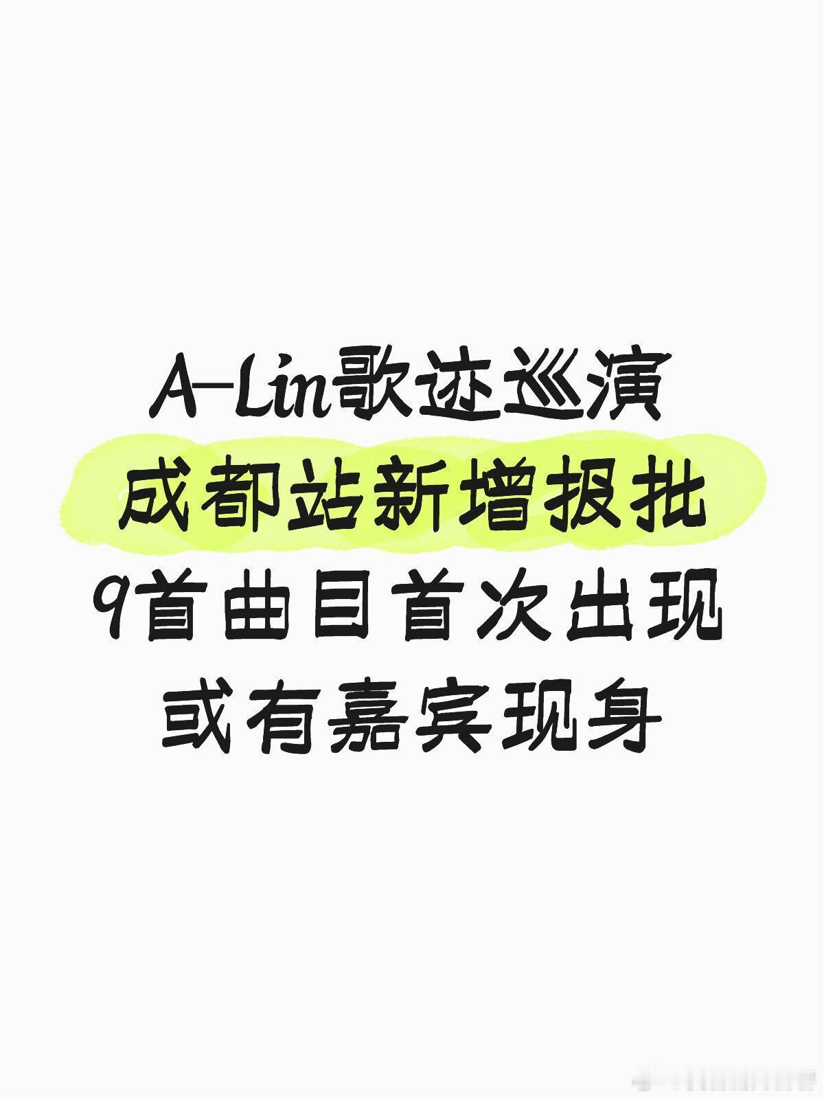 A-Lin歌迹巡演成都站新增报批曲目或有嘉宾截至1月23日成都站报批演出内容共计84首其中9首歌曲首次出现在本轮巡演报批歌单包括热门翻唱歌曲、近期电影电视剧ost、综艺演唱歌曲以及未演唱过或有嘉宾表演的曲目1️⃣连名带姓原唱:张惠妹2️⃣纠结重启feat.琟娜 Verna3️⃣某种可能电视剧《狙击蝴蝶》主题曲4️⃣男人KTV声生不息华流季第5期feat.李佳薇 原唱:胡彦斌5️⃣幸福在歌唱电影《阳光女子合唱团》幸福版主题曲6️⃣I'm sorry声生不息华流季第9期feat.林宥嘉 原唱:顺子7️⃣爱你原唱:王心凌8️⃣我会好好的原唱:王心凌9️⃣煎熬原唱:李佳薇