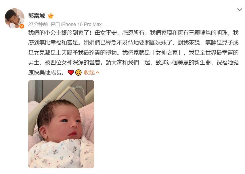 郭富城三胎宝宝到家:我们是「女神之家」10月22日据港媒,今天约下午3时,“天王”郭富城亲自驾车,与方媛的妈妈从住所出发,直达医院停车场接宝宝出院。 当晚,郭富城发文称: 我們的小公主終於到家了!母女平安,感恩所有。我們家現在擁有三颗璀𤌴的明珠,我感到無比幸福和富足。姐姐們已經急不及待地要照顧妹妹了,對我來說,無論是兒子或是女兒都是上天賜予我最珍貴的禮物。 我們家就是「女神之家」,我是全世界最幸運的男士,被四位女神深深的愛着。請大家和我們一起,歡迎這個美麗的新生命,祝福她健康快樂地成長。 郭富城与方媛相差22岁。郭富城出生于1965年10月,知名男演员、歌手、舞者。方媛出生于1987年7月,职业为模特。2015年,郭富城与方媛公开恋情,2017年正式成婚,婚后生下两个女儿,今年6月官宣38岁方媛怀三胎。 10月5日,郭富城在成都演唱会回应争议:“我没有刻意想要去生一个男生,我从来没有”,“都是我的孩子,我都是那么爱。哪怕三宝也是女儿,我觉得很开心呀!” 郭富城方媛三胎出生 郭富城郭富城说自己家是女神之家