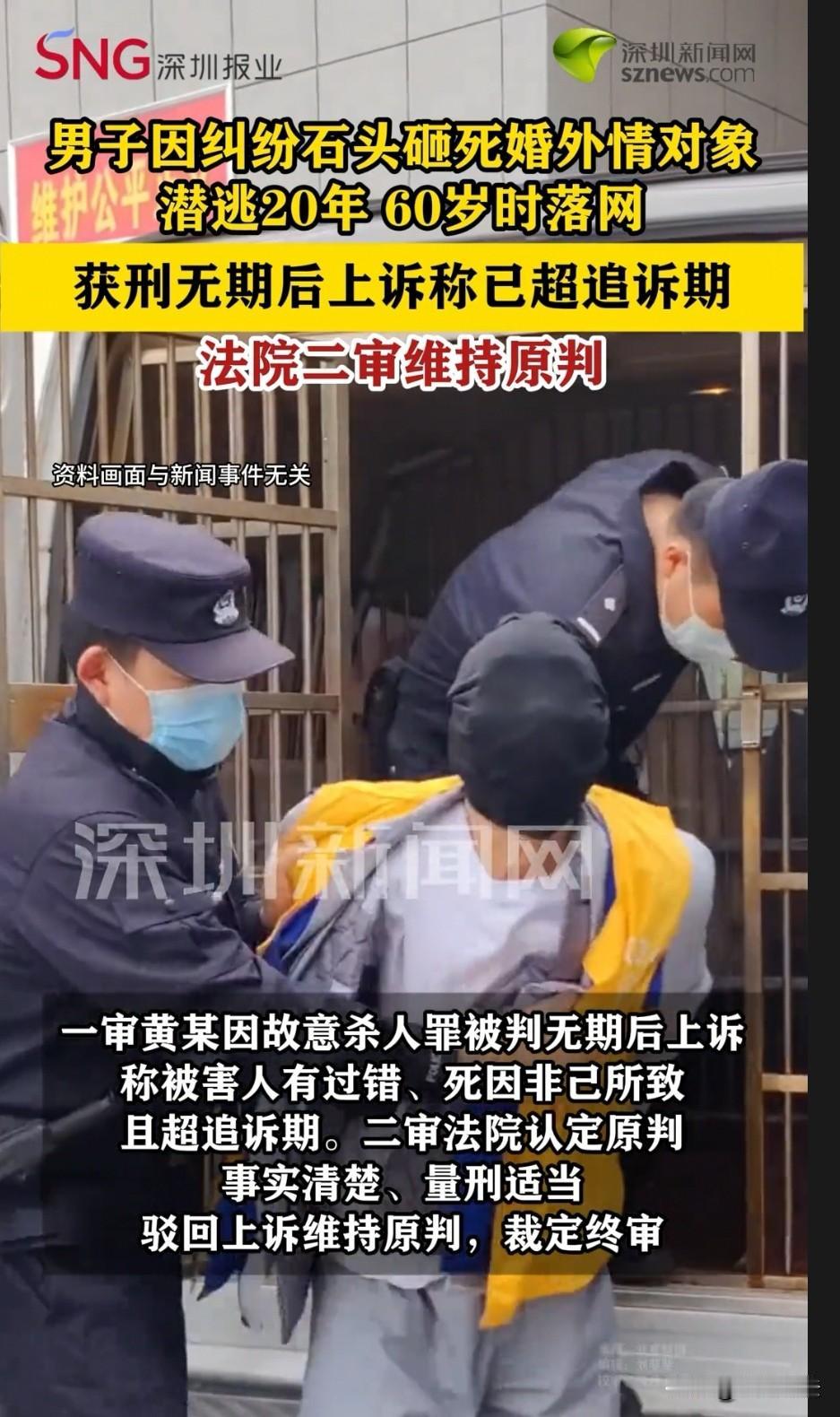 广西,40岁男子和婚外女友在拖拉机上起争执,男子拿石头砸向女友,对方当场离世,男子连夜跑路藏了20年,最后还是被抓,法院判了他无期徒刑。可60岁的他不服气上诉,说案子都过20年了,早就过追诉期了,不该判他。 2002年夏天,广西河池的一个乡镇,40岁的黄某那时候日子过得不错,家里有老婆孩子,还在外头找了个婚外女友谢某,俩人年纪差不多。 刚开始处的时候,俩人甜得很,一个眼神就知道对方想啥,做啥都想着迁就对方,互相都觉得跟对方在一起,日子能更有滋味。 因为信得过彼此,俩人还有经济往来,谢某帮黄某管着小生意的账目,黄某也常给谢某花钱贴补家用,都以为这份感情能一直好下去。 可日子久了,新鲜感没了,感情也变味了。 俩人因为生活琐事、对以后的想法不一样,还有互相猜忌,矛盾越来越多,从一开始的互相喜欢,变成了看对方哪儿都不顺眼,天天吵架,吵急了还动手推搡。 2002年7月的一天,黄某开着拖拉机拉着谢某去山里拉农产品,路上俩人又因为账目上的事吵起来了。 拖拉机车厢就那么点地方,谢某越说越生气,黄某被骂得火冒三丈,一肚子的火气全涌上来了,实在忍不了,随手抓起路边一块拳头大的石头,红着眼砸向了谢某。 谁知道这一下正好砸中谢某的头部要害,谢某当场倒在地上抽了几下,就没气了。 黄某看着倒在血里的谢某,瞬间吓醒了,心里全是害怕,压根没想过救人或者担责任,脑子里就一个念头:跑!赶紧跑!跑得越远越好! 他慌慌张张跳下车,连拖拉机都扔在路边不管了,一路狂奔躲进了深山里,这一跑,就藏了20年。 案子发生后,当地派出所很快就接到报案立了案,可2002年的时候,广西的乡镇里没什么网络,监控也几乎没有,现场留下的线索没多少,民警把周边村子都查遍了,也没找到黄某的影子,这案子就暂时搁下了。 一晃20年过去了,2022年的时候,警方的刑侦技术越来越先进,靠着DNA比对和大数据排查,终于在广西柳州一个偏僻的村子里,把60岁的黄某抓了。 这20年里,黄某一直隐姓埋名,靠打零工过日子。 开庭的时候,黄某承认自己当年杀了人,却狡辩说自己不是故意的,只是失手,觉得法院判太重了。 可法院查清楚了,黄某明知道拿石头砸头会出人命,还动手,这就是故意杀人,最后一审判了他无期徒刑,一辈子不能享受政治权利。 黄某不服,60岁的他在看守所里提起了上诉,说自己一是失手杀人,量刑太狠;二是案子都过去20年了,早就过了法律规定的追诉期,法院不该再追究他的责任。 《刑法》第二百三十二条(故意杀人罪):故意杀人的,处死刑、无期徒刑或者十年以上有期徒刑;情节较轻的,处三年以上十年以下有期徒刑。 《刑法》第八十七条(追诉时效期限):法定最高刑为无期徒刑、死刑的,经过二十年。如果二十年以后认为必须追诉的,须报请最高人民检察院核准。 《刑法》第八十八条(追诉期限的延长):在人民检察院、公安机关、国家安全机关立案侦查或者在人民法院受理案件以后,逃避侦查或者审判的,不受追诉期限的限制。 黄某的故意杀人罪,最高能判死刑,追诉期虽说20年,但这案子当年警方早就立案侦查了,他是故意跑路逃避追查,根本不受追诉期的限制。 他说自己失手的说法,也改变不了故意杀人的事实,法院一审的判决没问题,最后二审驳回了他的上诉,维持了原判。 对于此事,大家如何看? 素材来源于深圳新闻网