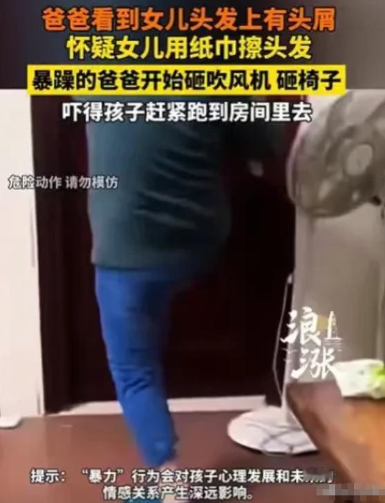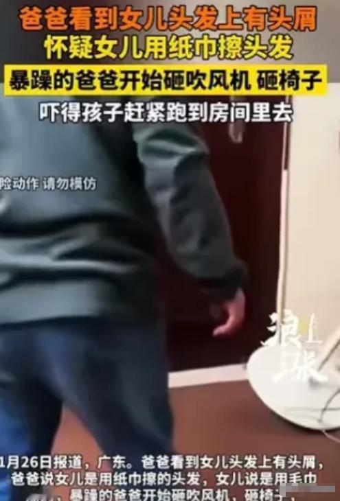 “有这样的父亲,何其不幸!”广东,女儿洗了头发,又吹干了头发,父亲却发现她的头发上有头屑,就一口咬定女儿用了纸巾擦头发,女儿反驳,说自己是用毛巾擦的,结果父亲暴怒,砸了吹风机,又砸了女儿的椅子,女儿恐惧地躲进房间,父亲更暴躁了,不停地砸女儿的房门,妻子制止丈夫,被丈夫殴打了,女儿的门被砸开之后,女儿也被父亲打了几巴掌。 最近广东发生的一件事,看了让人心里发沉,事情很简单,就是一个普通家庭里,女儿刚洗完头发,也用吹风机彻底吹干了,没想着惹出什么麻烦。 可父亲过来一看,发现女儿头发上有头屑,没问清楚情况,就一口咬定女儿是用纸巾擦的头发。 女儿觉得委屈,就小声反驳,说自己没用纸巾,是用毛巾擦的,还解释头发已经吹干了,不知道为什么还有头屑。 没想到就是这一句反驳,彻底惹恼了父亲,他当场就暴怒起来,顺手就抓起旁边的吹风机,狠狠砸在地上,吹风机瞬间就坏了,砸完吹风机还不解气,又把女儿坐的椅子也砸了,椅子倒在地上发出巨响。 女儿吓得浑身发抖,一句话也不敢再说,转身就往自己房间跑,赶紧关上房门还反锁了,只想躲起来保命。 可父亲变得更暴躁了,追到房门口,不停地用手砸门,还用脚使劲踹门,门把手被拧得咯吱响,门板也被砸得咚咚直震,嘴里还不停地骂着难听的话。 孩子的母亲看着丈夫失控的样子,实在忍不住上前制止,劝他冷静一点,别吓着孩子。 可暴怒的丈夫根本听不进去,反过来就对妻子动了手,动手殴打妻子,把妻子也打得不敢再上前阻拦。 没过多久,女儿反锁的房门就被父亲砸开了,他冲进房间,一把抓住吓得缩在角落的女儿,抬手就给了女儿几巴掌,巴掌落在脸上的声音清晰可闻,女儿吓得直哭,却不敢躲闪,也不敢再反驳一句。 这件事被曝光后,很多人都在谴责这位父亲。就因为一点不起眼的头屑,一点小小的反驳,就做出这么极端的行为,砸东西、打妻子、打女儿,根本没把家人的感受放在眼里。 这样的暴力行为,给女儿和妻子带来的伤害,恐怕很久都难以抹去,也让人真切感受到,有这样一位失控的父亲,对孩子来说,真的是莫大的不幸。 以上都是个人观点,对此您有什么不同的看法,可以在评论区留言讨论!!!