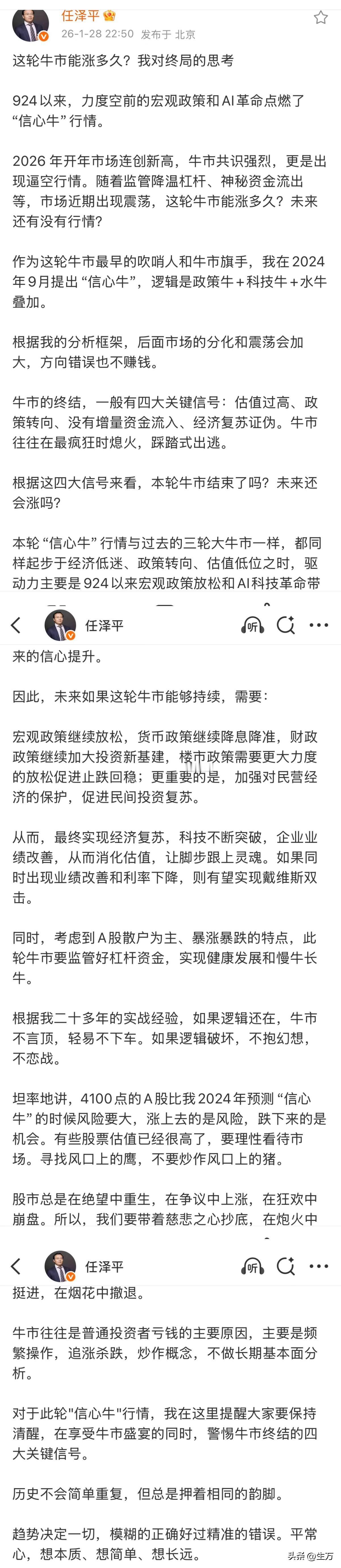 任泽平深夜发文:牛市能涨多久? 已经到了深夜了,不知道为啥睡不着觉,而是洋洋洒洒的写了一篇比较专业的文章,看起来他要显示自己对这一轮的终极思考了! 他从9月24号分析,一直到现在,大概的意思就是其实现在还是一个慢牛,但越是这样越不要贪婪,时时刻刻要保持清醒的状态才行,在他看来历史虽然不会相同的重复,但是任何事情都有迹可循,要找到属于自己的韵律和节奏。 但其实这一点相对来说还是比较难的,尤其是对于普通老百姓来说,根本就不能够掌握这种感觉,因为很多人脑子里面想的就是怎样赚钱,根本就不会考虑,现在任何平台对对信息的控也比较严格,所以他也不能够说得很明显。 意思就是谁也不能够一锤定音,但是有时候模糊的正确,比清晰的精致更加的稳定,所以大家还是怀着一个平常心,简简单单才能够长长远远,如果想一口吃一个大胖子,那么这个胖子一定不是自己,而是被别人吃。 所以越是年头,年尾的时候,大家约是要沉住气,保持自己愉快的心情,有时候超脱物外,反而能够让自己的内心更加的纯粹,相对来说才能清楚更多,看准确更长久。