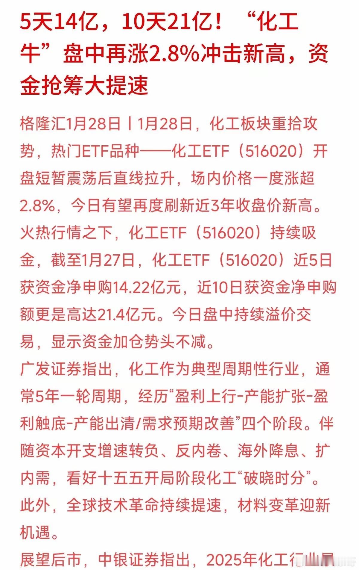 10天爆买21亿!这一冷门板块悄悄创3年新高,机构在抢什么?5天砸进14亿,10天扫货21亿!当你还在盯着科技股震荡时,聪明钱已经悄悄在这一“传统板块”完成了暴力建仓。盘中再涨2.8%,资金这是急了?这一波行情来得非常凶猛。数据不会骗人,化工ETF(516020) 近期简直是“吸金黑洞”,不仅场内价格直线拉升,冲击近3年来的收盘新高,盘中更是持续溢价交易。这意味着什么?意味着买盘太强,卖盘不够用了!为什么是化工?很多人觉得化工是夕阳产业,但机构看的是周期。广发证券说得很直白:化工作为典型周期行业,通常5年一轮。现在正处于产能出清、需求预期改善的“破晓时分”。 加上最近高层喊话“反内卷”,行业恶性竞争减少,龙头企业的利润修复就在眼前。看看持仓就懂了,万华化学、盐湖股份这些大白马,既有业绩底,又有新材料的故事可讲。别只盯着大烟囱,现在的化工涵盖了AI算力材料、机器人、新能源。这波资金抢筹,赌的就是2026年行业盈利的全面修复。大家觉得现在追进去是“接盘侠”,还是赶上了周期牛市的早班车?评论区聊聊你的看法!