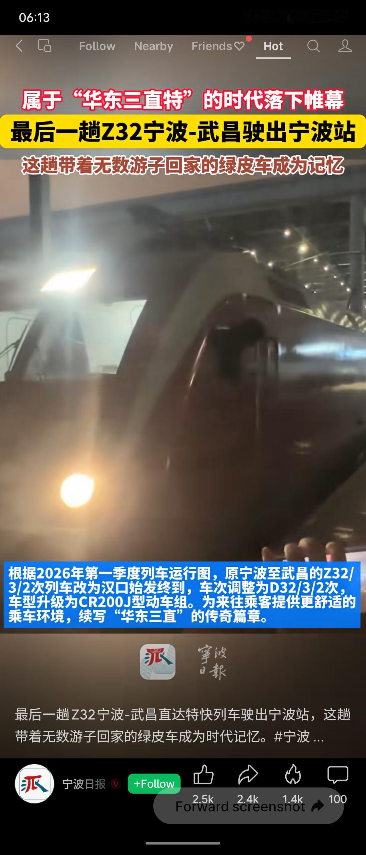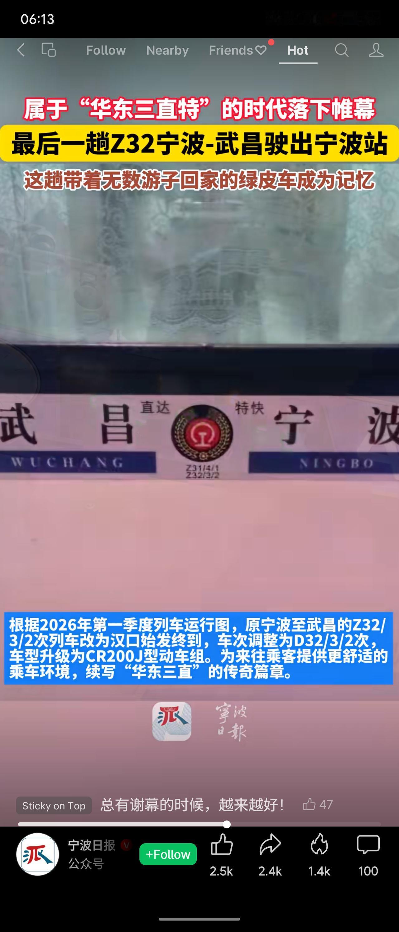 最后一趟Z32次绿皮直快列车驶离宁波站,标志着“华东三直特”时代的落幕。这趟曾连接宁波与武昌、承载无数游子归家记忆的列车,已根据新运行图升级为D32次动车组,改由汉口始发终到,以更快的速度和更舒适的环境延续其服务使命。