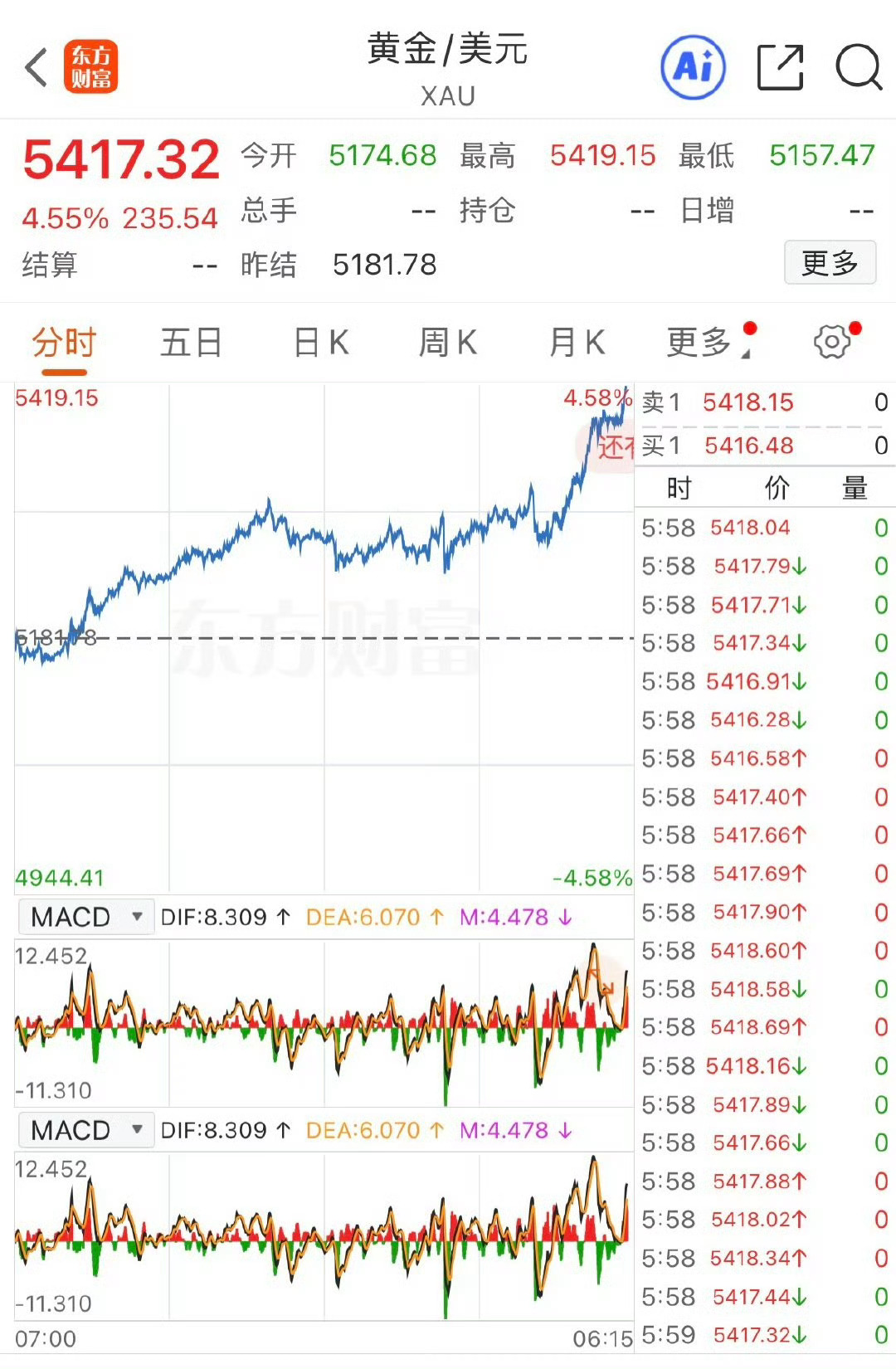 【#黄金站上5400美元#】#金价一路狂飙不停# 1月29日,现货黄金日内涨幅扩大至4.2%,报5400美元/盎司,续创新高。(财联社) #黄金白银基金暂停申购##金价波动#