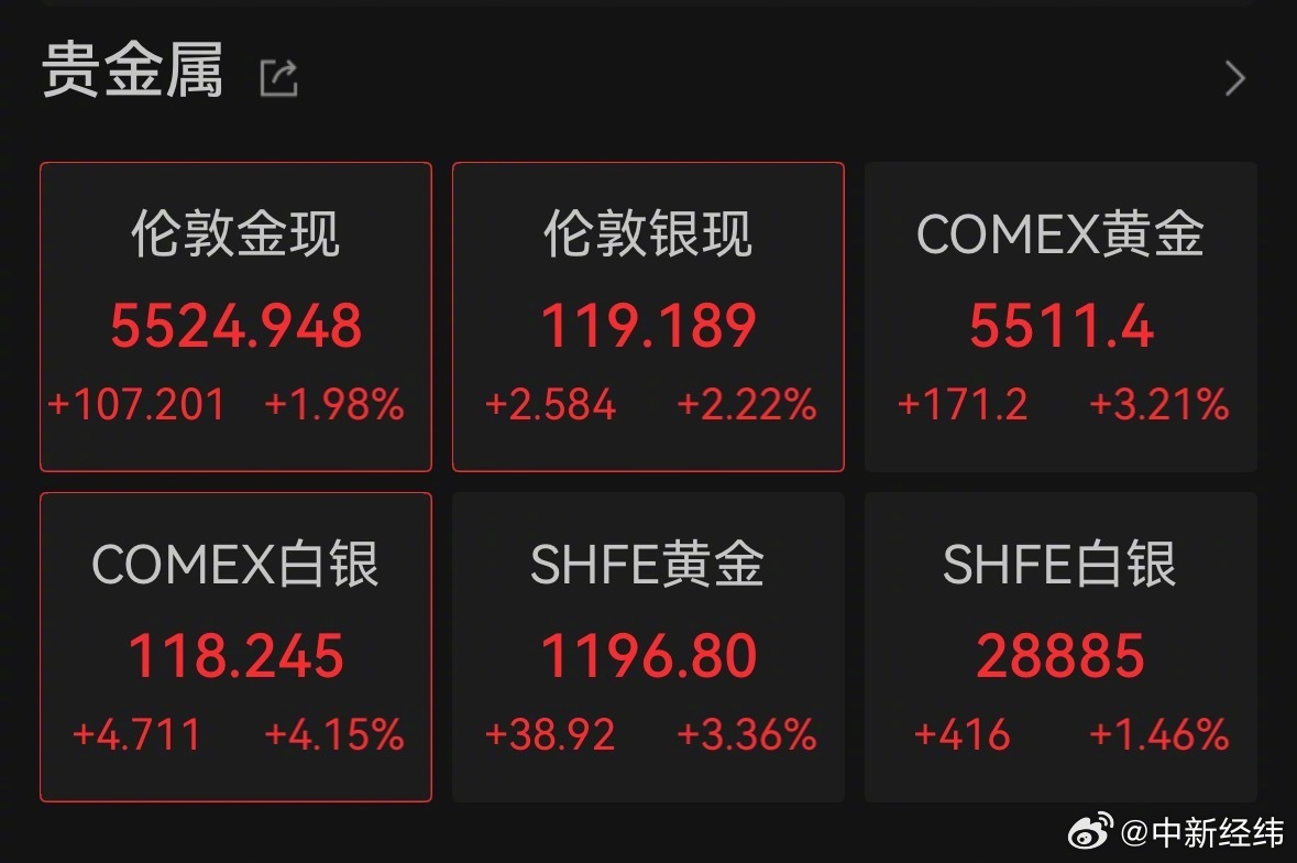 【#黄金突破5500美元##金价站上5500美元# 】北京时间1月29日早间,伦敦金现、COMEX黄金期货价格双双突破5500美元/盎司,再创历史新高;伦敦银现价格逼近120美元/盎司。现货黄金日内涨1.5%,周涨幅超500美元或10%。#黄金继续疯涨# (中新经纬)#黄金站上5400美元##金价一路狂飙不停# #黄金白银基金暂停申购##金价波动# #美联储# #水贝黄金回收克价突破1100元##黄金变现业务爆了#