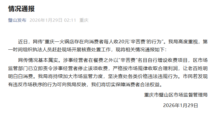 【#官方回应火锅店按人头收辛苦费#】#火锅店按人头收辛苦费被叫停# 近日,有媒体报道了重庆一火锅店按人头收取“辛苦费”,老板称菜品、酒水按成本价售卖。1月29日,重庆市璧山区市场监督管理局发布情况通报称,第一时间组织执法人员赶赴现场开展核查处置工作,网传情况基本属实。涉事经营者在餐费之外以“辛苦费”名目自行增设收费项目,区市场监管部门已立即责令涉事经营者停止该项收费,严格按市场规律收取合理利润,让老百姓明明白白消费。通报提到,将持续加大市场监管力度,坚决查处各类价格违法违规行为。市民若发现有违反市场秩序的行为可进行反映,将切实保障消费者合法权益。(璧山发布)
