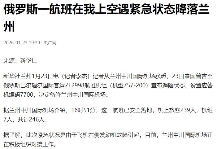突发特讯! 中方向全球通告:俄罗斯一架客机在我上空遇紧急情况,发求救信号备降兰州,239名乘客和7名机组人员平安着陆,引发全球高度关注。 1月23日,当时俄罗斯蓝色航空AZV2998航班正从泰国普吉飞往本土巴尔瑙尔,机上239名乘客多是结束度假返程的游客,7名机组人员各司其职,原本该是一场寻常的跨国飞行,却在进入中国四川上空时突发变故。 机组人员发现右侧发动机出现异常振动,动力随之下降,危机之下,他们立即启动紧急程序,将应答机编码设置为7700——这个国际民航通用的紧急信号,像一道红色警报,瞬间传至中国空管系统。 7700代码意味着什么,其实它并非特指“飞机即将坠毁”的极端险情,而是向地面管制宣告“飞机遇紧急情况,需优先获得协助和降落权”,常见于发动机故障、机上人员突发疾病等场景。 与它并列的还有7500、7600两个紧急代码,三者分工明确,能让空管在第一时间判断事件性质。 此次AZV2998航班挂出7700后,中国民航西北地区空管中心瞬间绷紧神经,管制员一边快速与机组确认故障细节,一边立即启动应急响应,一场与时间赛跑的空中救援就此展开。 此时航班面临的首要问题,是如何安全备降。波音757机型的最大起飞重量远高于最大降落重量,当时航班刚起飞不久,燃油充足,直接降落会给机身结构和刹车系统带来极大负荷,甚至引发危险。 因此,在空管的引导下,航班转向西北方向,在兰州周边空域开始盘旋。从飞行数据来看,飞机在30分钟内完成了3次完整盘旋,高度从10600米逐步降至3000米,这个过程既是在消耗燃油减重,也是机组在故障状态下稳定飞机姿态、评估剩余动力的关键阶段。 选择兰州中川国际机场作为备降场,也经过了周密考量:这里拥有4000米长的跑道,足以支撑波音757安全降落,且作为西北枢纽机场,导航设施、应急救援能力都处于高水平。 下午4时51分,在空管的精准引导下,这架仅靠单侧发动机运转的客机,以参考着陆速度平稳降落在兰州中川机场T3跑道。 落地瞬间,早已在跑道旁待命的3辆消防车呈“箭头”队形跟随滑行,12个应急小组迅速到位,医护、地勤、公安等多方力量无缝衔接。机组打开舱门后,乘客们在机组人员指挥下有序撤离,全程无混乱、无人员受伤,当最后一名乘客踏上地面时,现场响起了自发的掌声,紧绷的神经终于得以舒缓。 这场从发出求救信号到安全落地的应急处置,全程高效有序,甚至没有对机场其他航班的正常起降造成大面积影响,展现出的专业水准让国际航空界为之侧目。 落地后的安置工作,更体现了细节里的温度。兰州中川机场迅速调配20名俄语翻译,解决了语言沟通障碍,同时准备了3辆摆渡车和100份热食,30分钟内完成所有保障资源集结。 海关开通“紧急通道”,采用“先放行后补单”模式,将原本需要90分钟的通关时间压缩至25分钟,最大程度减少旅客等待。 当晚8时许,239名乘客陆续出关,被分批转运至机场周边3家四星级酒店。酒店特意启用应急接待模式,提供带俄语频道的电视、24小时医疗咨询,还根据乘客的宗教信仰和饮食禁忌,定制了清真、素食等5类菜单,甚至安排了10名心理咨询师提供团体辅导,缓解大家的焦虑情绪。 从机组处置来看,机长康斯坦丁·伊万诺夫在发现故障后,立即执行快速检查单,关闭故障发动机并启动辅助动力单元,全程与空管和航司运行中心实时沟通,操作完全符合国际民航组织规范,展现了专业机组在危机中的核心作用。 从中国的应急体系来看,空管1分钟内清空周边50公里空域,地面多部门同步联动,从引导、降落、救援到安置的全流程无缝衔接,印证了我国民航应急保障体系的成熟度。 要知道,当时正值下午航班运行高峰,密集的航线中为故障航班开辟专属绿色通道,既考验调度能力,更彰显了“生命至上”的处置原则。 目前,事件的后续处置仍在有序推进。俄罗斯蓝色航空已派出技术团队赶赴兰州,对故障飞机进行全面检修,初步调查显示故障或与发动机长期高频使用导致的金属疲劳有关,最终结论需等待黑匣子数据解读完成。 航司同时启动了旅客权益保障专项基金,承担所有安置费用及改签损失,还调配了一架波音767客机作为替代航班,保障旅客后续返程。 其实在全球航空业中,紧急备降并非罕见事件,但能实现“零伤亡、零混乱、高效率”的处置,却离不开每一个环节的专业与负责。 它不仅让246个家庭免于悲剧,更向全球展示了跨国航空应急协作的典范——当险情发生时,国界不是障碍,专业与责任才是守护生命的核心。 对于普通乘客而言,这起事件也提醒我们,遇到飞行紧急情况时,听从机组指挥、保持冷静,是保障自身安全的关键。 这起发生在中国空域的紧急备降事件,最终以圆满结局落幕,不仅是一次成功的救援,更是全球航空业安全保障能力的一次生动实践。 MCN双量进阶计划
