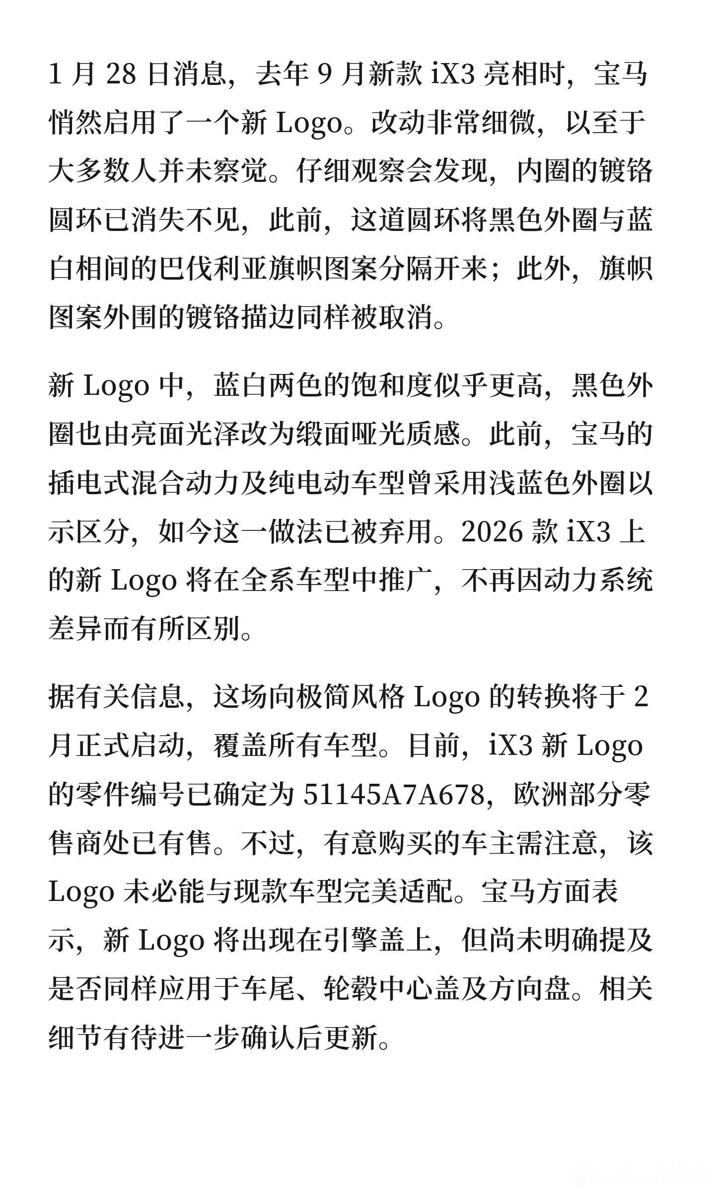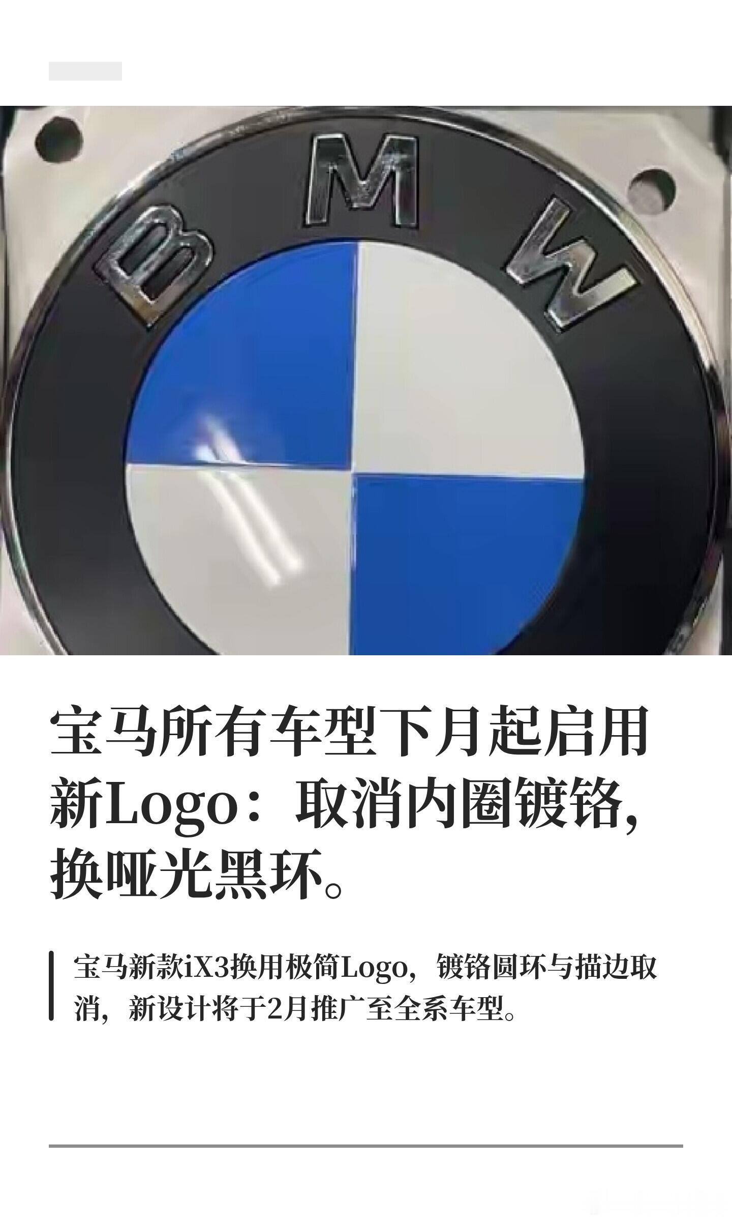 大v聊车 宝马所有车型下月起启用新Logo:取消内圈镀宝马新款 iX3 Logo 更新,内圈镀铬圆环及描边取消,黑色外圈改为缎面哑光,蓝白图案饱和度提升,整体更简洁现代。新Logo将于2月推广至全系车型,部分细节仍待确认。