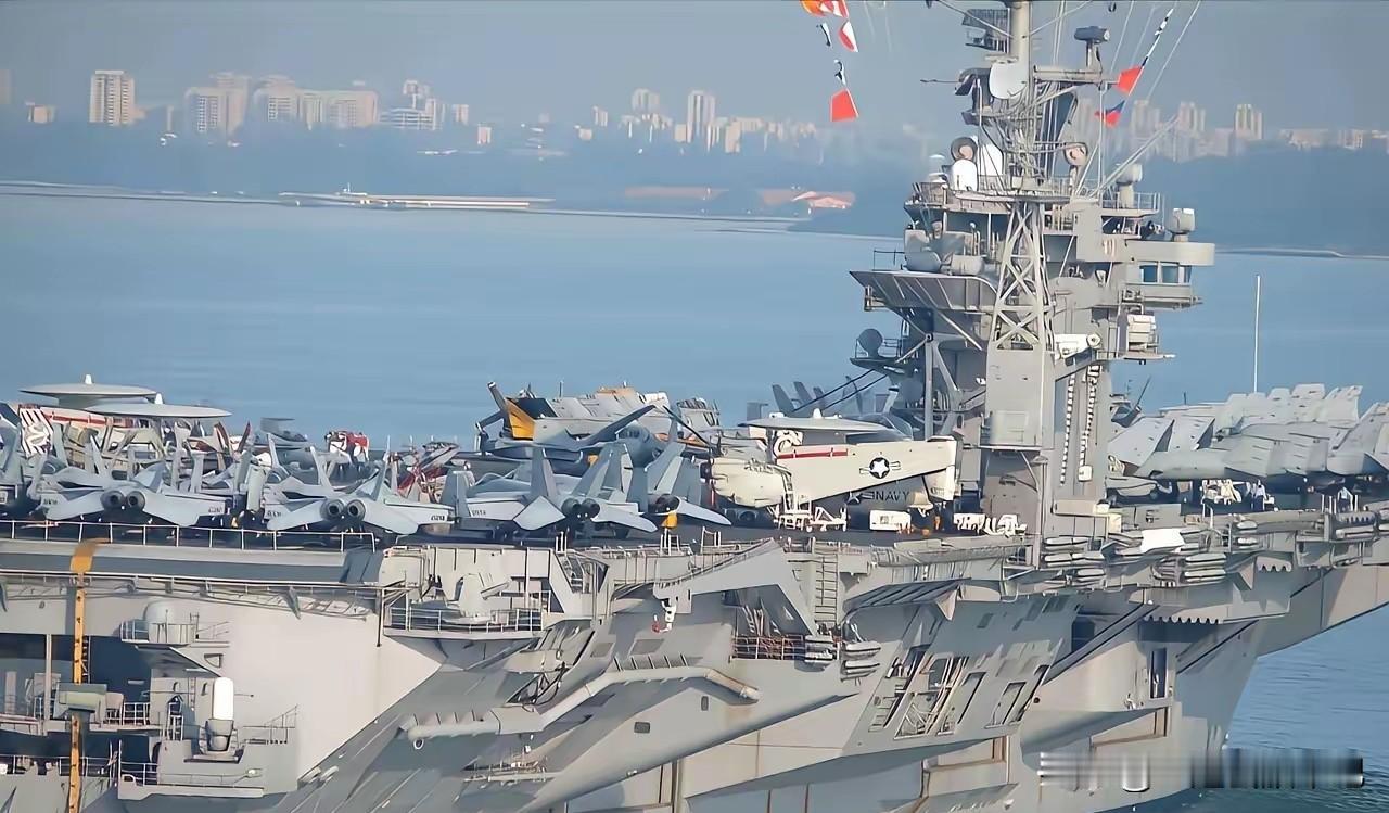 美军的核动力航母,停靠新加坡。 甲板停满了舰载机,还有预警机,看上去,压迫感爆满。 核动力航母最牛的就是出海不用带补给舰,加注一次燃料可以用12年。 但是美军航母从远处看,有的地方锈迹斑斑,这说明在海上航行时间长,属于正常现象。