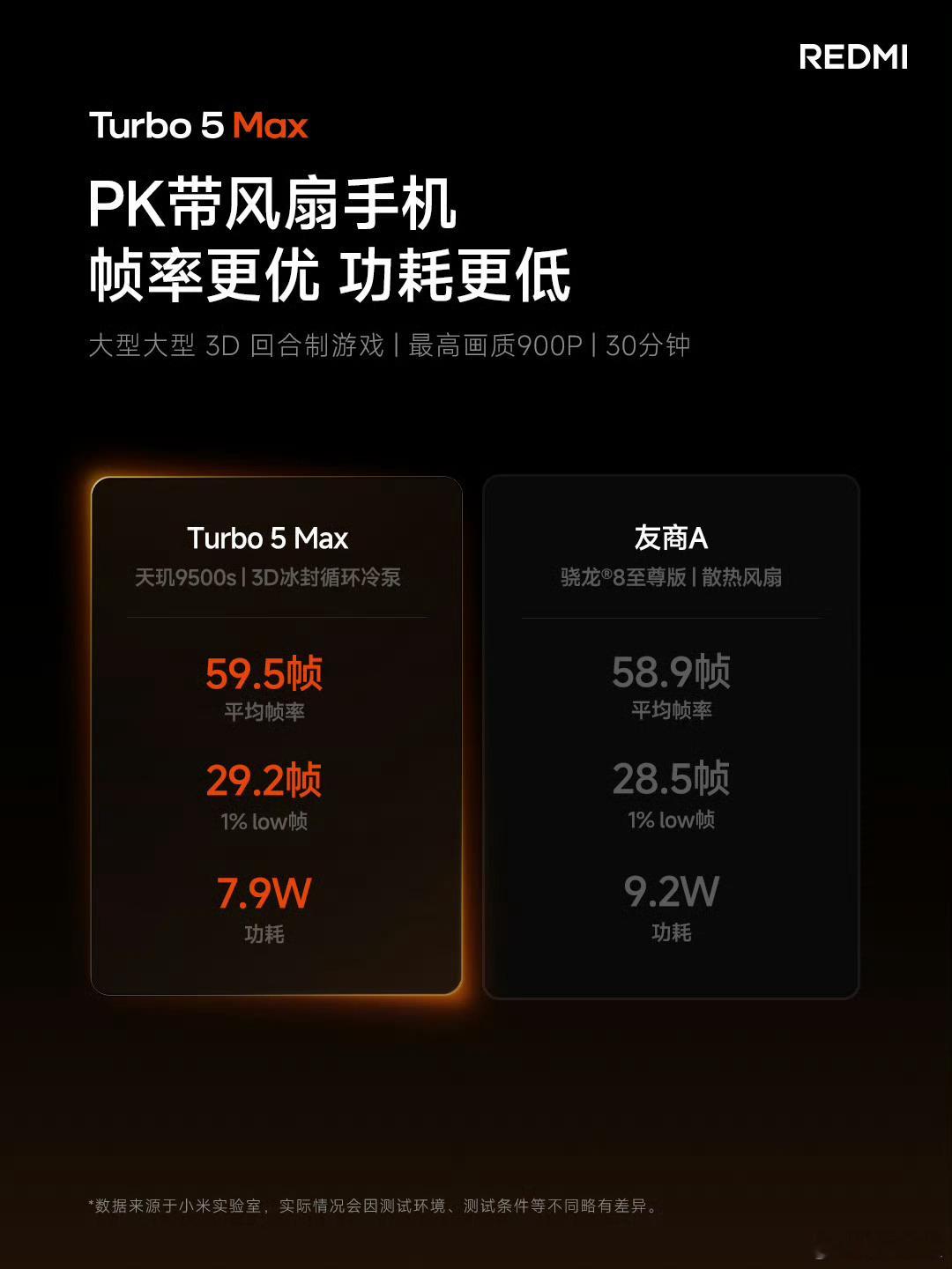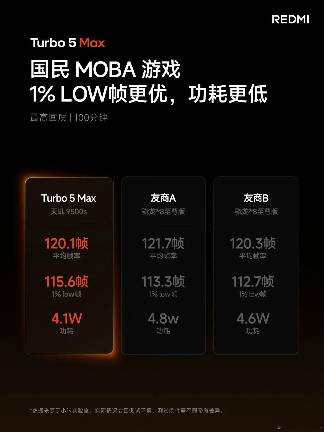 REDMI Turbo5Max的狂暴引擎配合天玑9500s确实有点东西。不仅跑分超361 万,重点是和带风扇的同档手机相比,帧率更高更稳定的同时,功耗还更低。王者荣耀最高画质100分钟,平均帧率120.1帧,1%Low帧115.6帧,功耗4.1W;星穹铁道最高画质30分钟,平均帧率59.5帧;不止性能,REDMI Turbo5Max还搭载了9000mAh 金沙江电池,支持100W有线秒充,100W PPS充电协议,实测续航高达10小时。