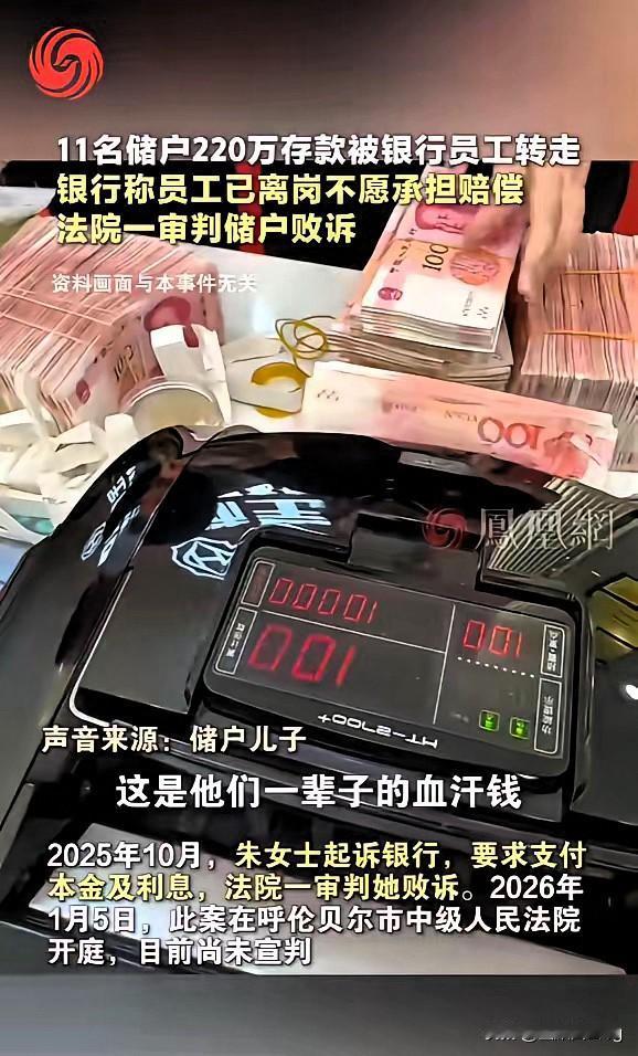严查到底!内蒙古11名储户220万存款被银行员工转走,讨说法反遭银行甩锅,起诉后竟然还败诉了,这结果真的太离谱!储户老老实实把钱存银行,凭的就是对银行的信任,员工能轻易转走存款,本质就是银行的监管形同虚设,岂能一句“个人所为”就撇清所有责任? 银行本就有保障储户存款安全的法定义务,十多位储户的钱接连被转走,足以说明银行在人员管理、业务审核上全是漏洞。不能把员工的违规操作成本,全让无辜的储户来承担,这不仅寒了储户的心,更会让大家对银行的信任大打折扣。一审判决只看表面,却忽视了银行的核心责任,这样的结果谁能信服? 储户的钱凭什么要为银行的监管不力买单?真心希望上诉能有公道结果,守住储户的血汗钱。大家觉得,该如何让银行扛起该有的责任,保护好储户的存款安全呢?