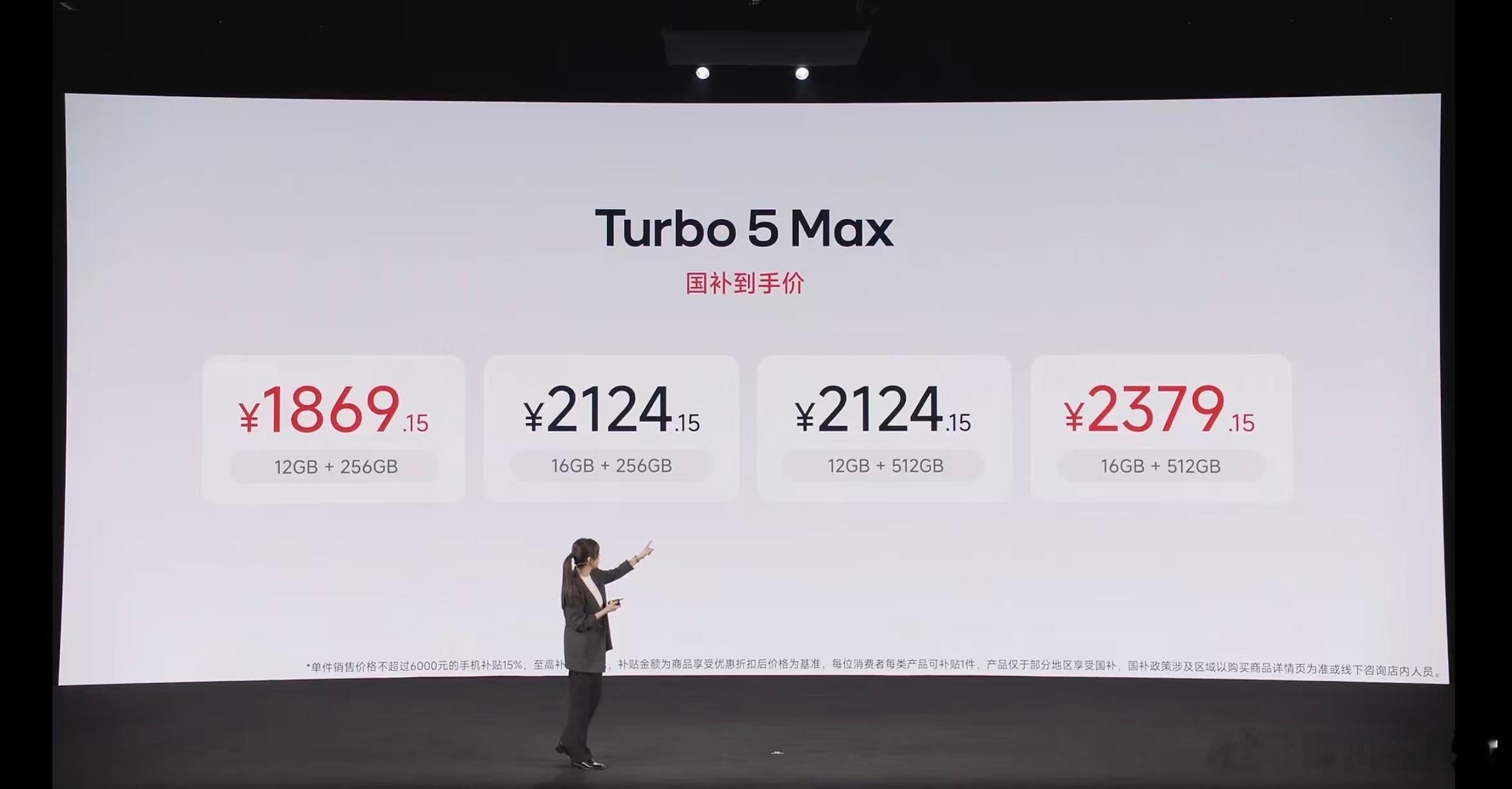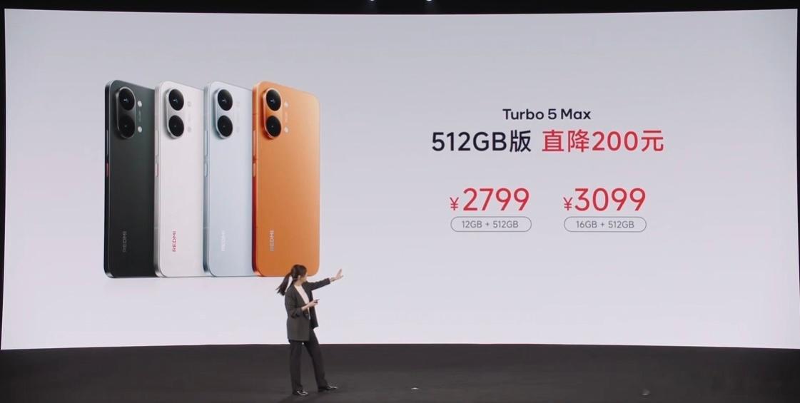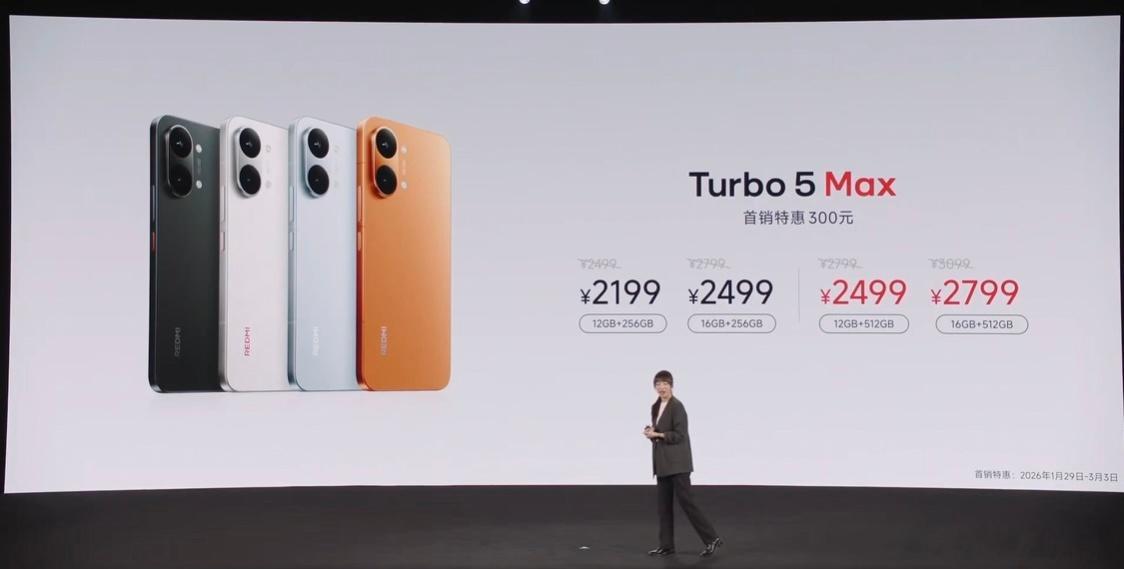 红米Turbo5发布会REDMI Turbo 4 Pro卖的可以,上市18天卖了100万台,这次Turbo 5 Max首发天玑9500s处理器,LPDDR 5X Ultra + UFS 4.1存储,跑分突破361万分,6.83英寸1.5K屏幕,内置9000mAh电池,支持100W快充 + 27W反向充电,双1115F对称双扬、超声波指纹,暗影黑、祥云白、海风蓝、阳光橙4个色,玻璃机身 + 玻纤后盖,厚8.15mm,重219g,12 + 256GB版售2199元起(国补完1869元起),这价格怎么样