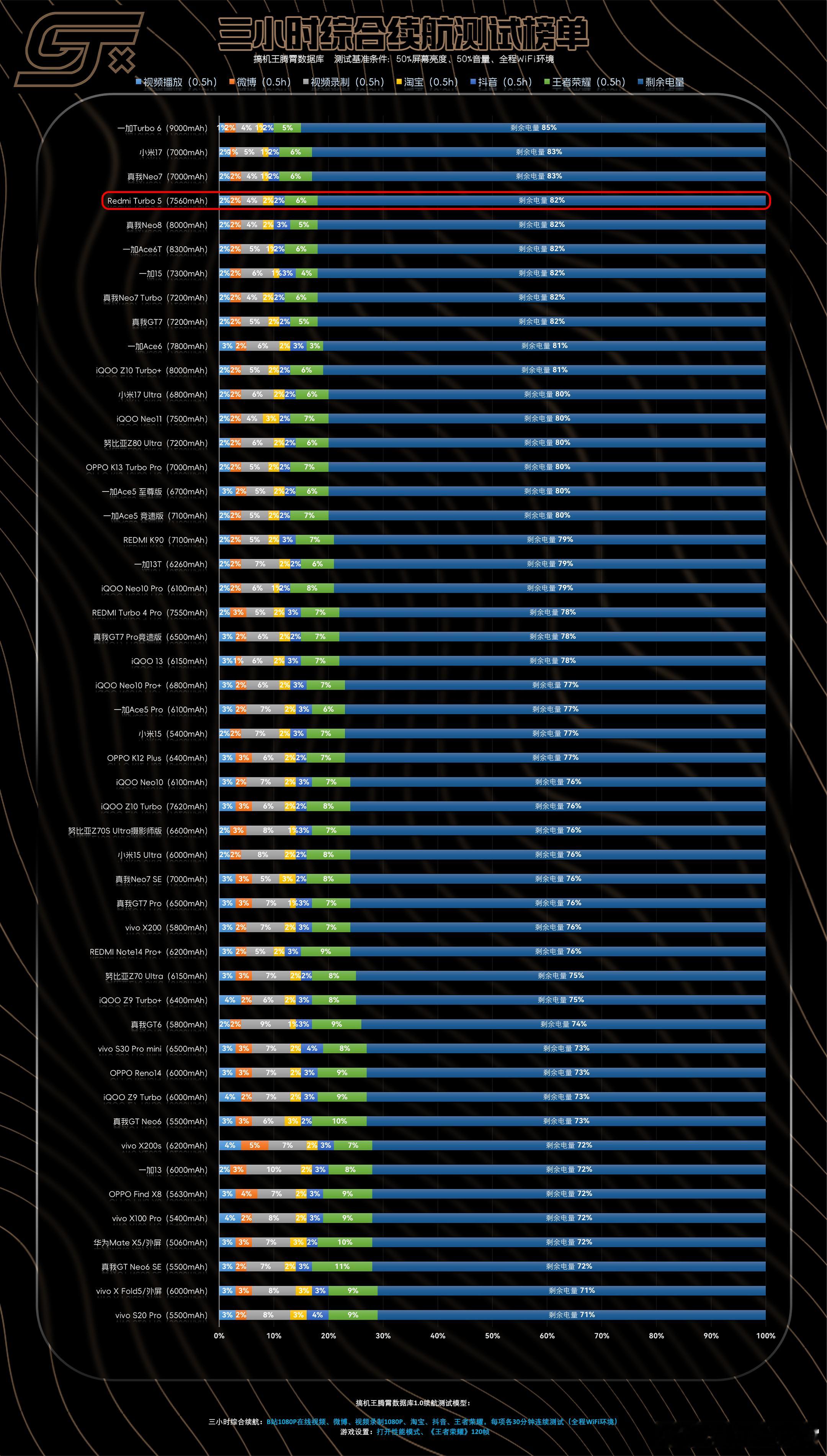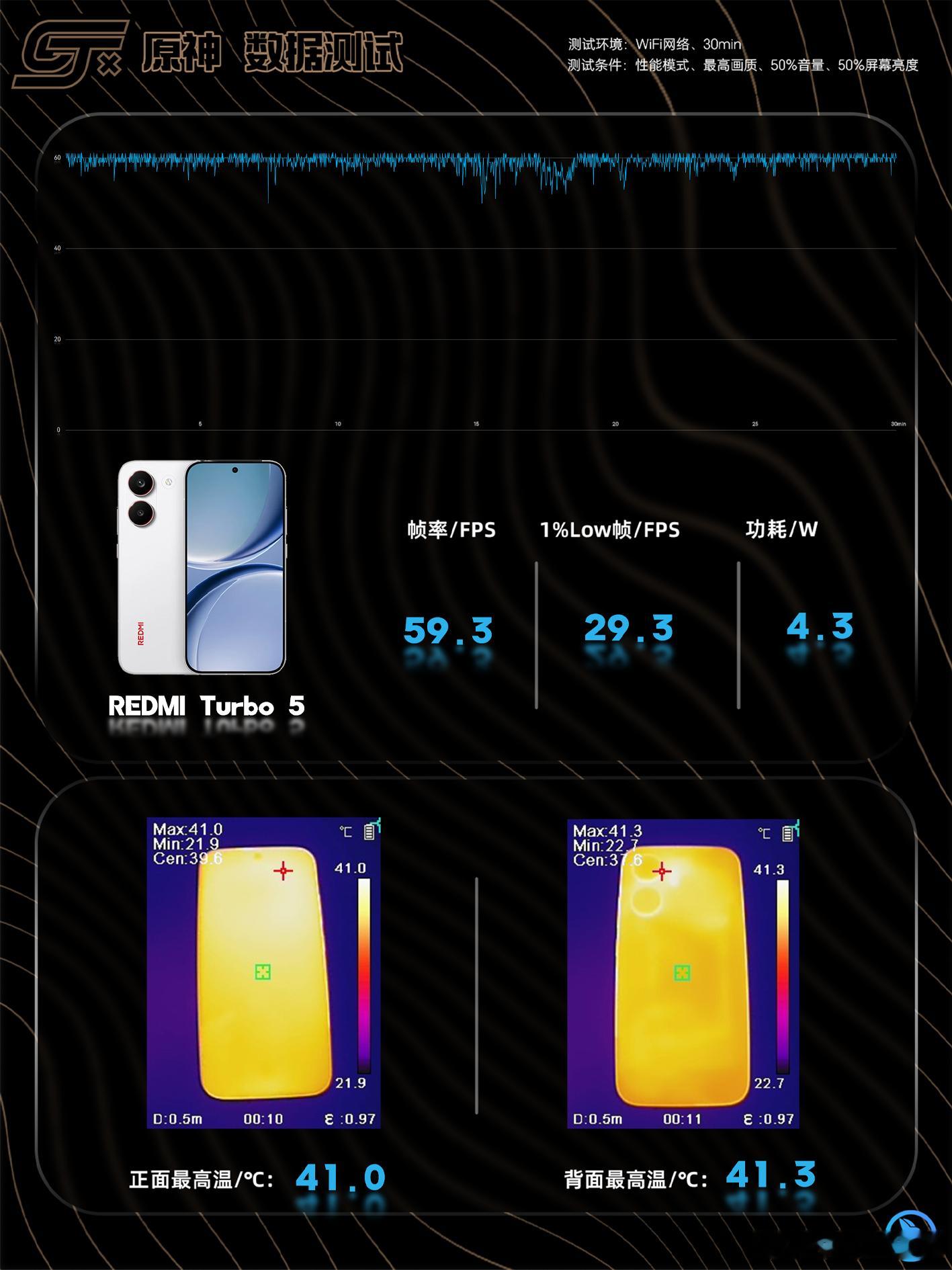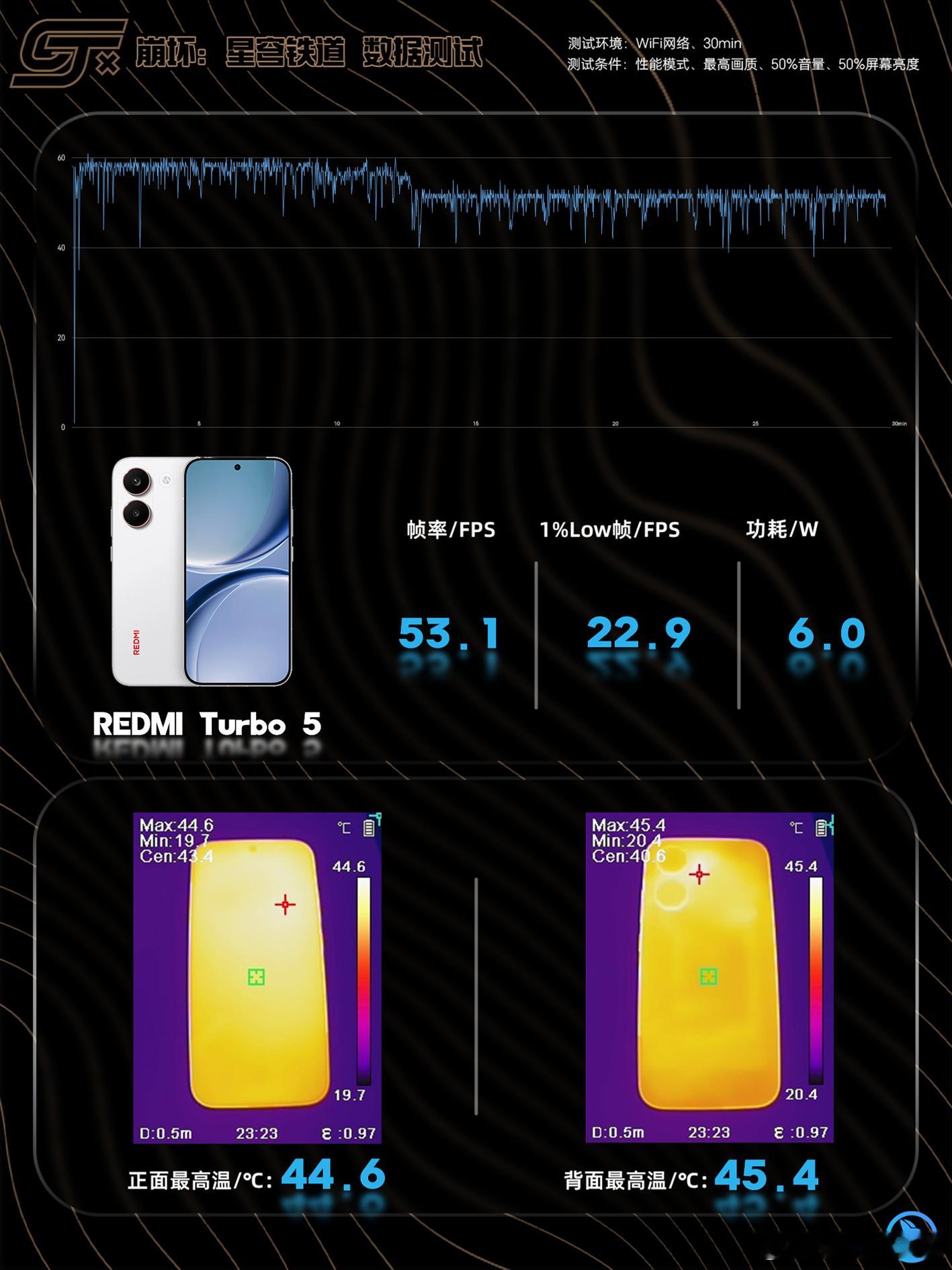 Turbo5首发测评来聊聊REDMI Turbo 5的实际表现,天玑8500-Ultra的首发机型,台积电4nm工艺制程,这代CPU和GPU规格都较上代更高,算是目前最强的天玑8000系芯片。安兔兔跑分接近230万分,GeekBench 6单核1732分、多核6967分。室温25℃左右,通过PerfDog实测,《王者荣耀》极高帧率 + 极致画质双开,半小时平均120.1帧,功耗3.4W、最高温在正面40.2℃;半小时《原神》一路跑图 + 打怪,平均59.3帧、功耗4.3W、最高温41.3℃,除了中间帧率小幅波动外,基本上可以保持满帧流畅运行;重载《崩坏:星穹铁道》黄金的时刻冲刺跑图,半小时平均53.1帧、功耗6W、最高温45.4℃,13分钟之后帧率锁在了50帧左右,不过全程还算平稳。虽然是中屏尺寸,但电池给到了7560mAh,三小时综合续航测下来剩82%的电量,续航表现排名前列,同时100W有线快充把充电时间控制在了1小时内,半小时充68%,前台充满总耗时55分钟,应急的时候也能以27W的功率给其它设备反向充电,国补完1699元起的价格其实还可以,这表现咋样