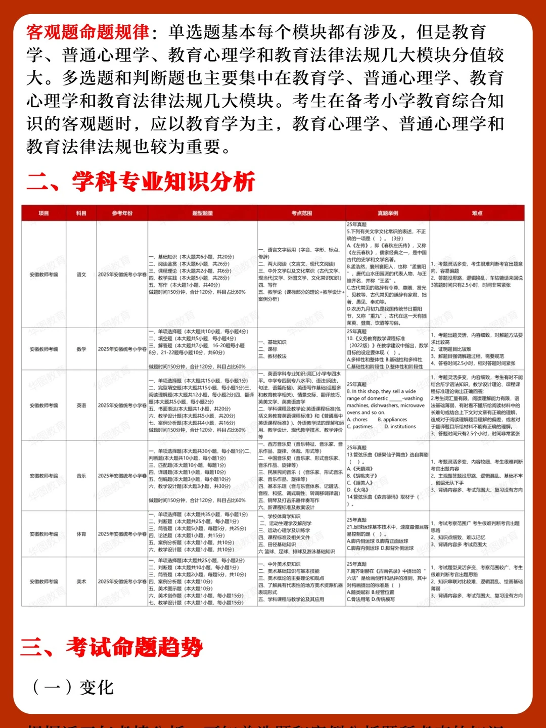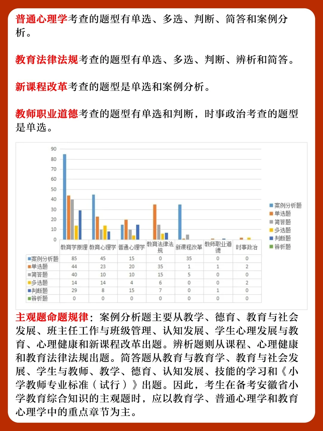 安徽教师统考分为笔试和专业测试 笔试考《学科专业知识》(满分120分)、《教育综合知识》(满分120分) 两科分小学和中学卷(初中、高中是一套卷子)