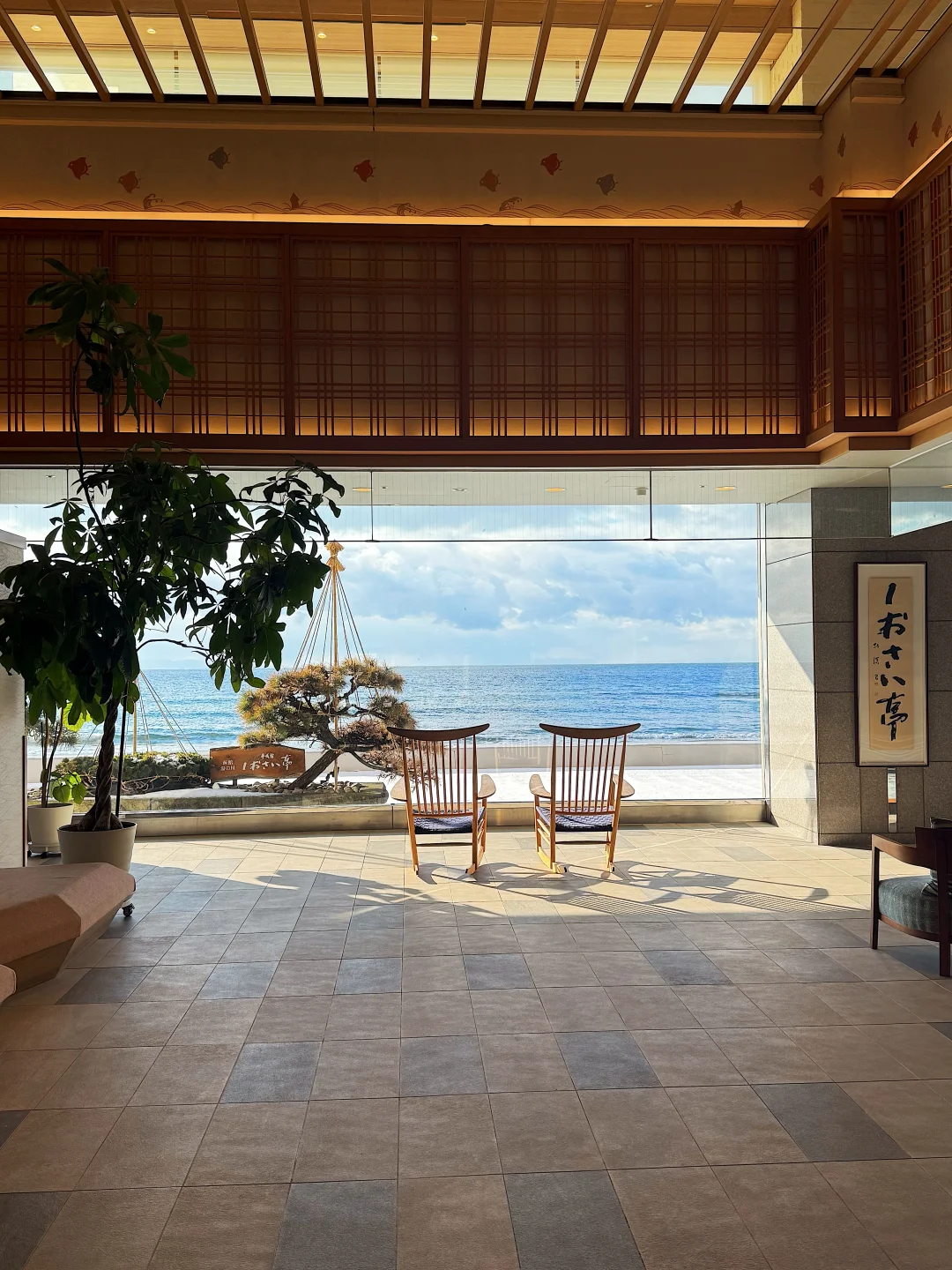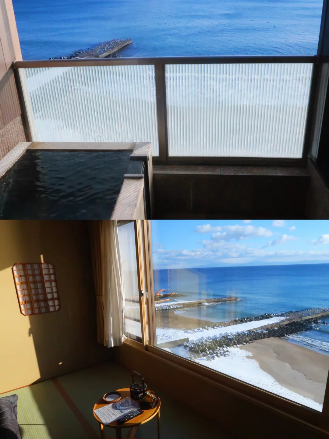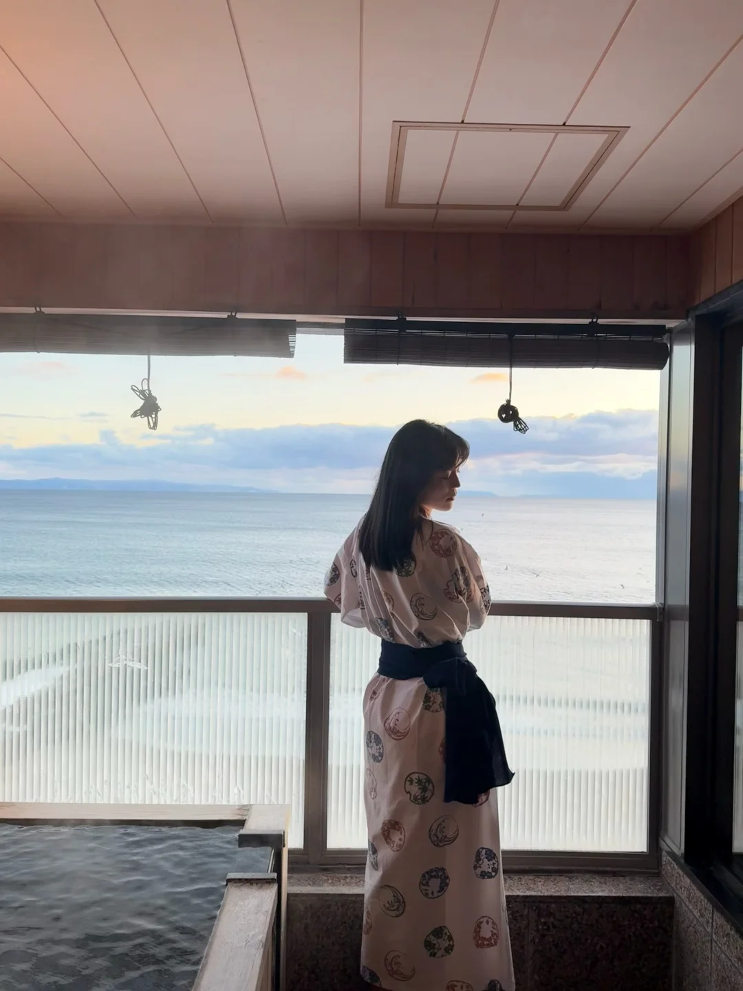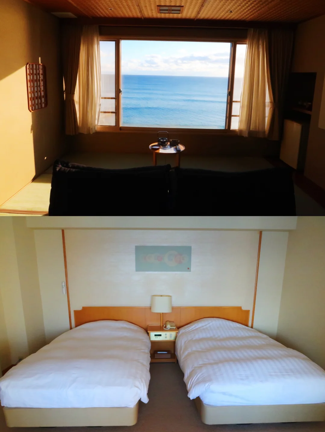 我住的是 和洋式海景房带私人露天浴池(花月馆),早上醒来,穿浴衣泡在房间私汤里看海,阳光洒进房间,海浪轻拍窗外,整个人都放空了。榻榻米睡不惯,但洋式床很舒服,房间虽有岁月痕迹,但干净整洁,每个细节都透着用心。