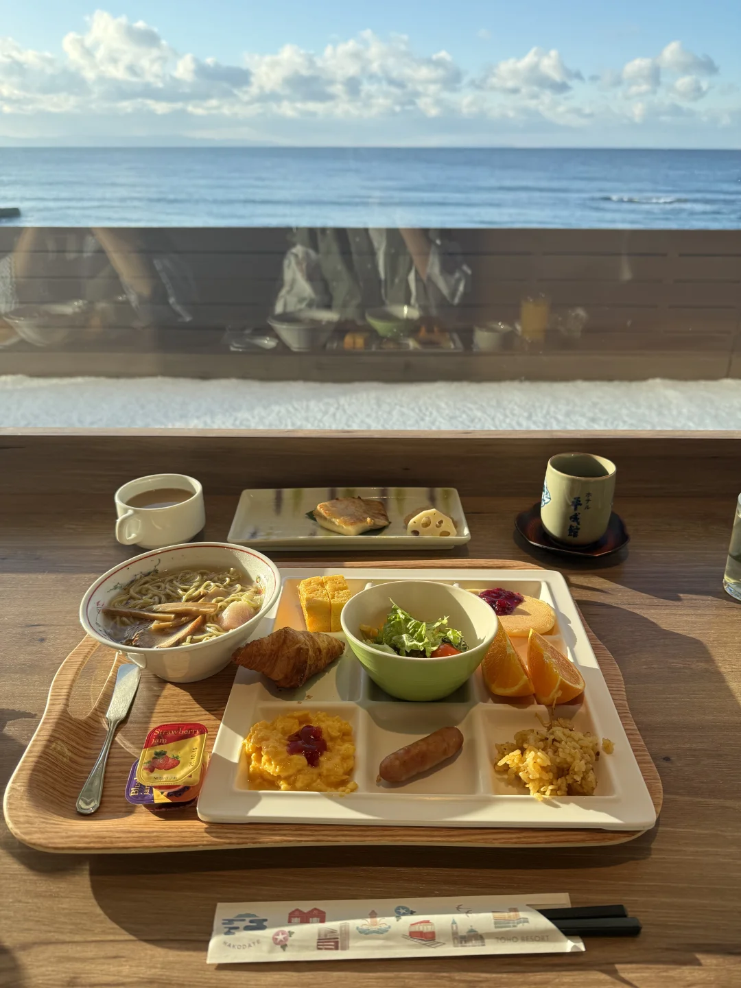 一泊两食餐食味道中规中矩,晚餐是老派日式会席,最爱吃甜虾和菠萝;早餐可安排海景座位,景色比较治愈,早餐喜欢吃拉面和沙拉。
