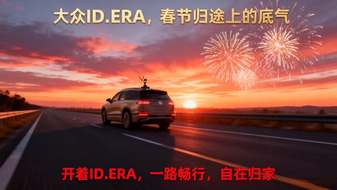 大众ID.ERA,不只是一台车,更是你春节归途上的底气。它用德系的严谨与智慧,重新定义了长途出行的从容。让回家的路,只剩下期待与温馨,再无里程的烦恼。这个春节,开着ID.ERA,去见你想见的人,去往你心之所向的地方,一路畅行,自在归家。
