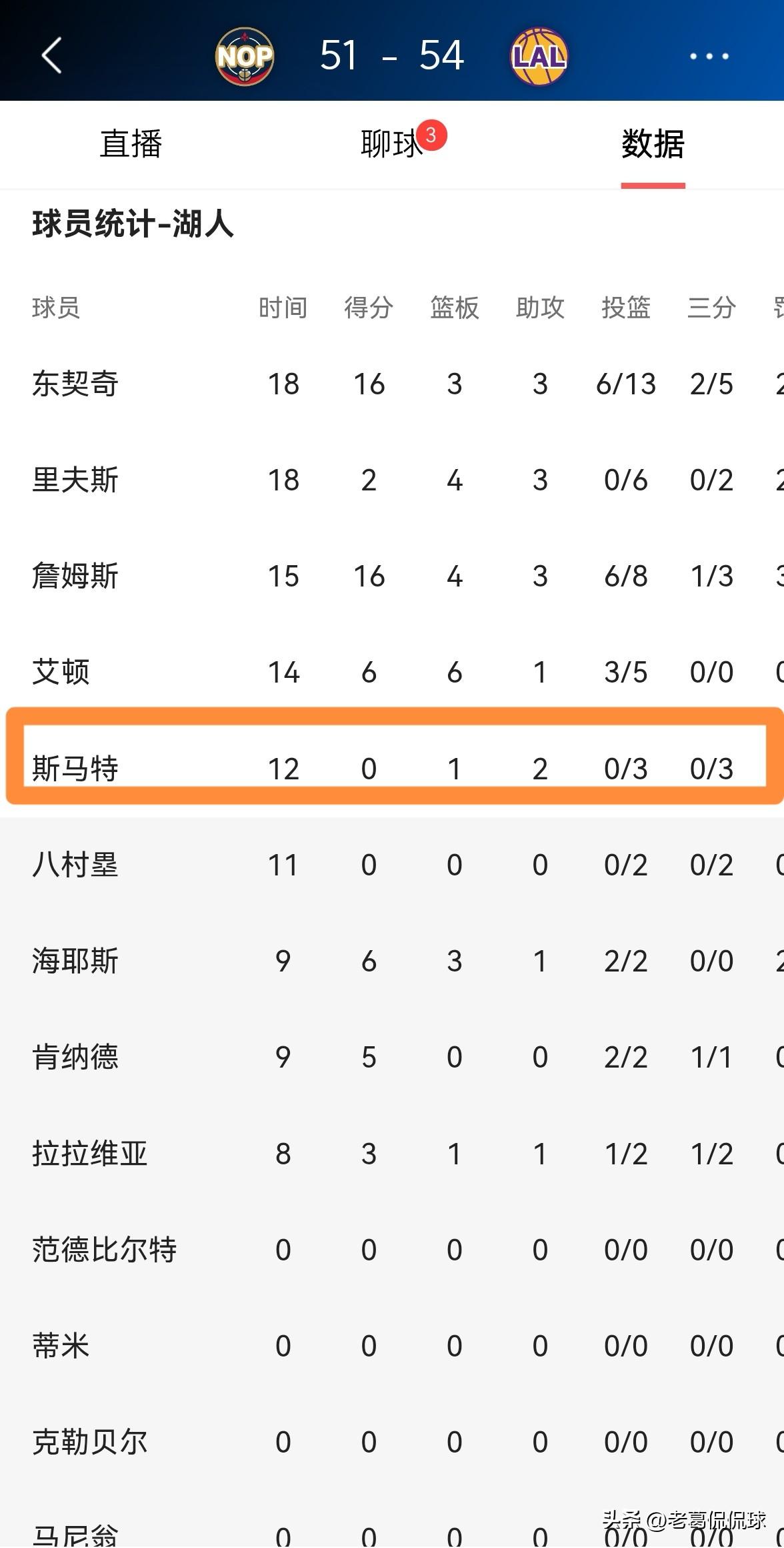 湖人大将斯玛特真是手感全无!在今天湖人主场迎战鹈鹕的比赛中,目前两队的上半场比赛已经结束湖人以54:51处于领先。在前两节比赛中,斯玛特的手感非常的冰凉,他在三分线外颗粒无收。 在前两节比赛中,斯玛特首发出战12分钟,三分球3中0怒砍0分,不过有1篮板2助攻1抢断1盖帽,他的场上正负值为+1。 期待斯玛特能够在下半场比赛中找回投篮手感,不然的话斯玛特很有可能会惨遭主帅雷迪克的弃用。