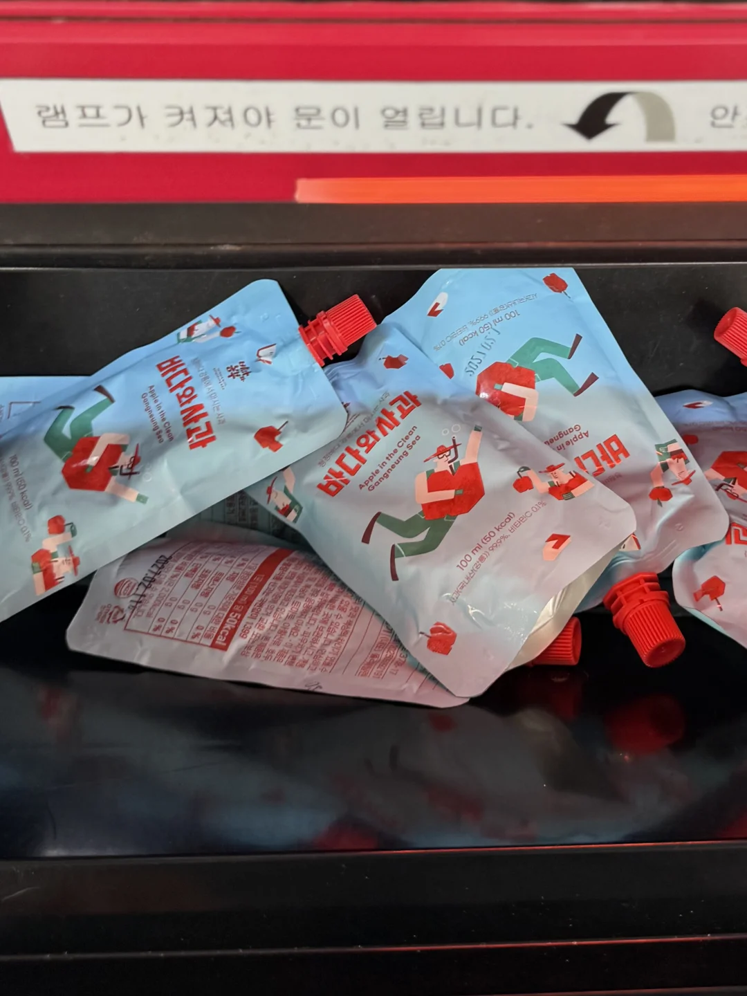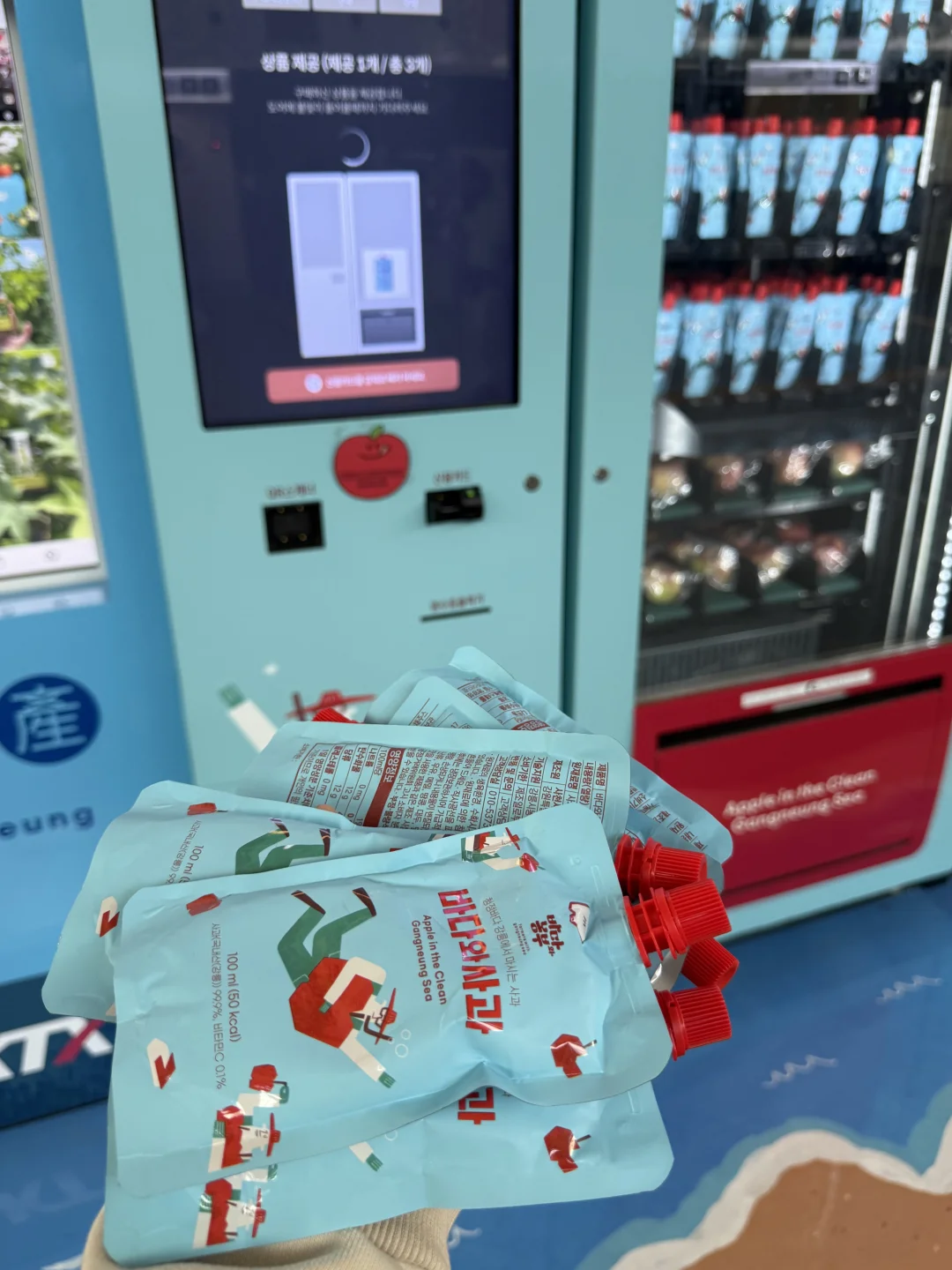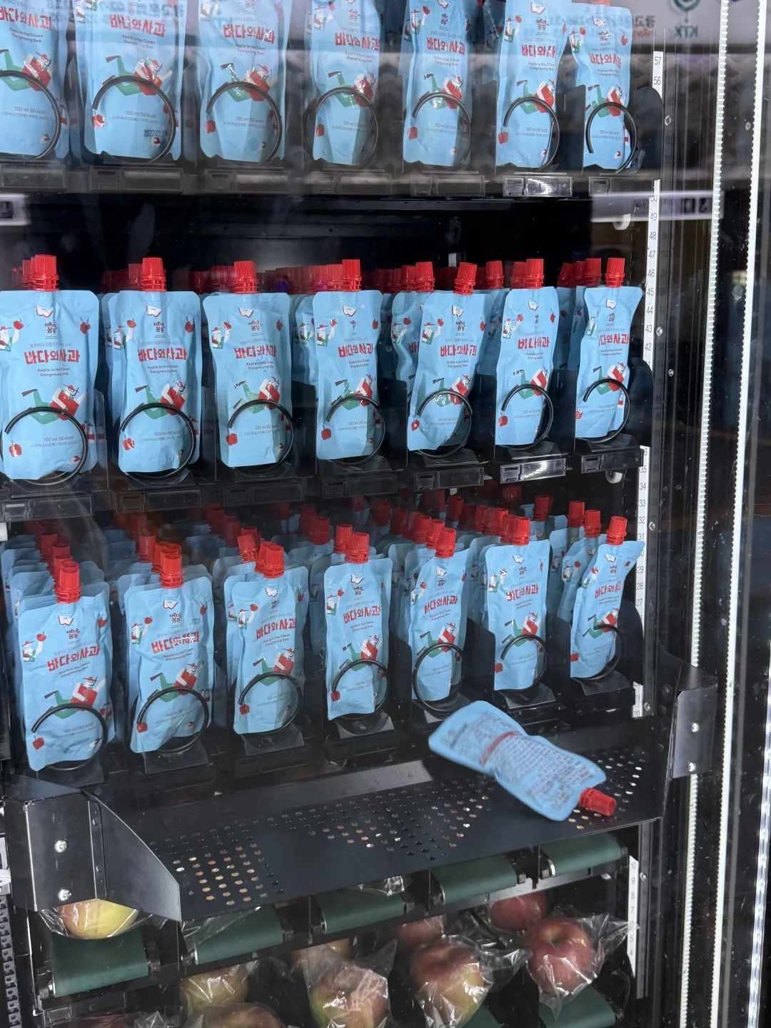在韩国江陵站的自动贩卖机买了好多袋苹果汁🧃配料居然是苹果99.9%,喝起来像在啃刚切开的苹果,酸甜清爽不齁甜,路过真的可以盲买!