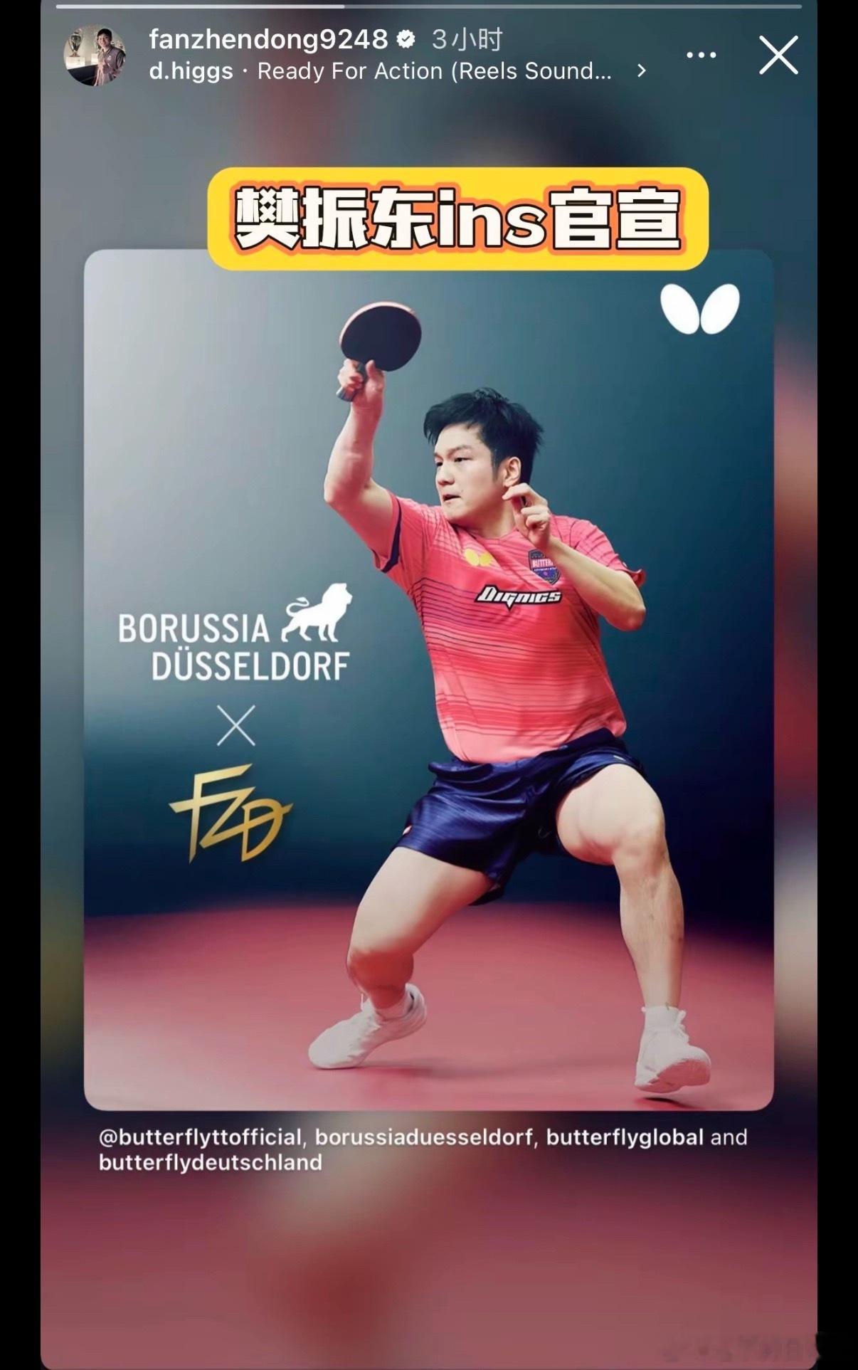 樊振东转发杜塞官宣发文 3月17日樊振东在个人社媒转发杜塞尔多夫俱乐部的加盟官宣,配文“Ready for action;Go,don't stop!”正式确认加盟。他将在7月1日正式转会,与邱党等名将组队,继续征战德甲开启新挑战。