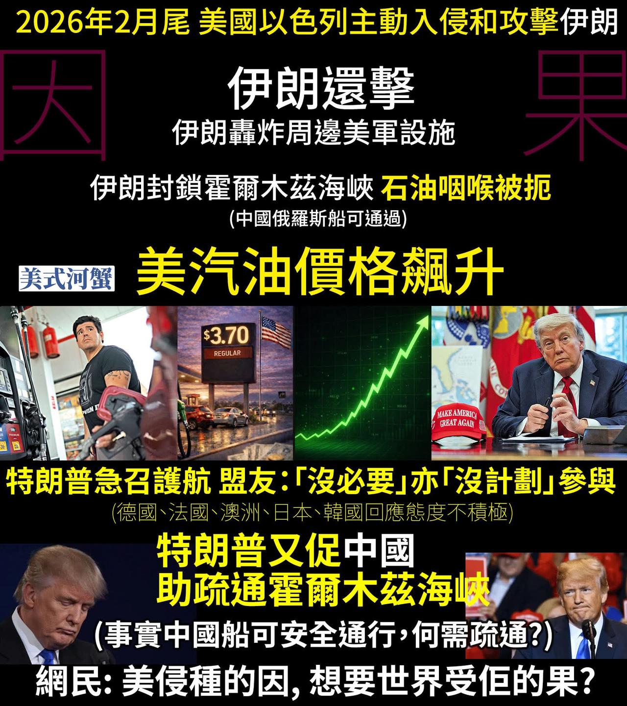 特朗普「又要威,又要戴头盔」,又话无限弹药又话好快赢。 转头又要拉盟又落水,又要求中国。 最惨系想靠吓,但又临时缩沙。 高Sir想特朗普心知肚明,他可不可以访华?不是他说来不来,而是我们中国有没有兴趣、以及批不批准!另外,中国船早已可以安全通过霍尔木兹海峡,只是美国走不了。 美军最大航母火灾被曝持续超30小时中方:向伊朗等4国提供人道主义援助