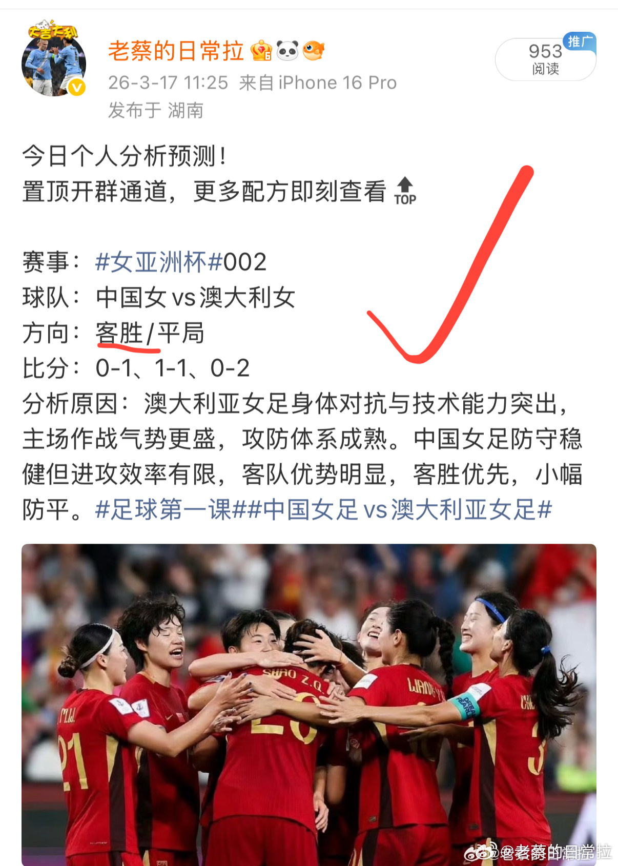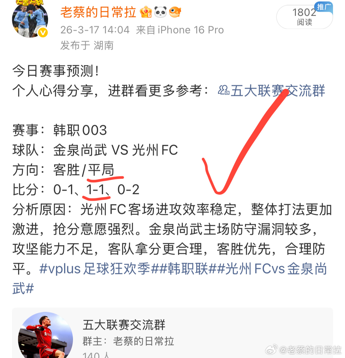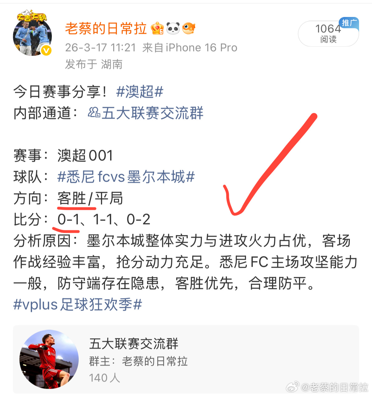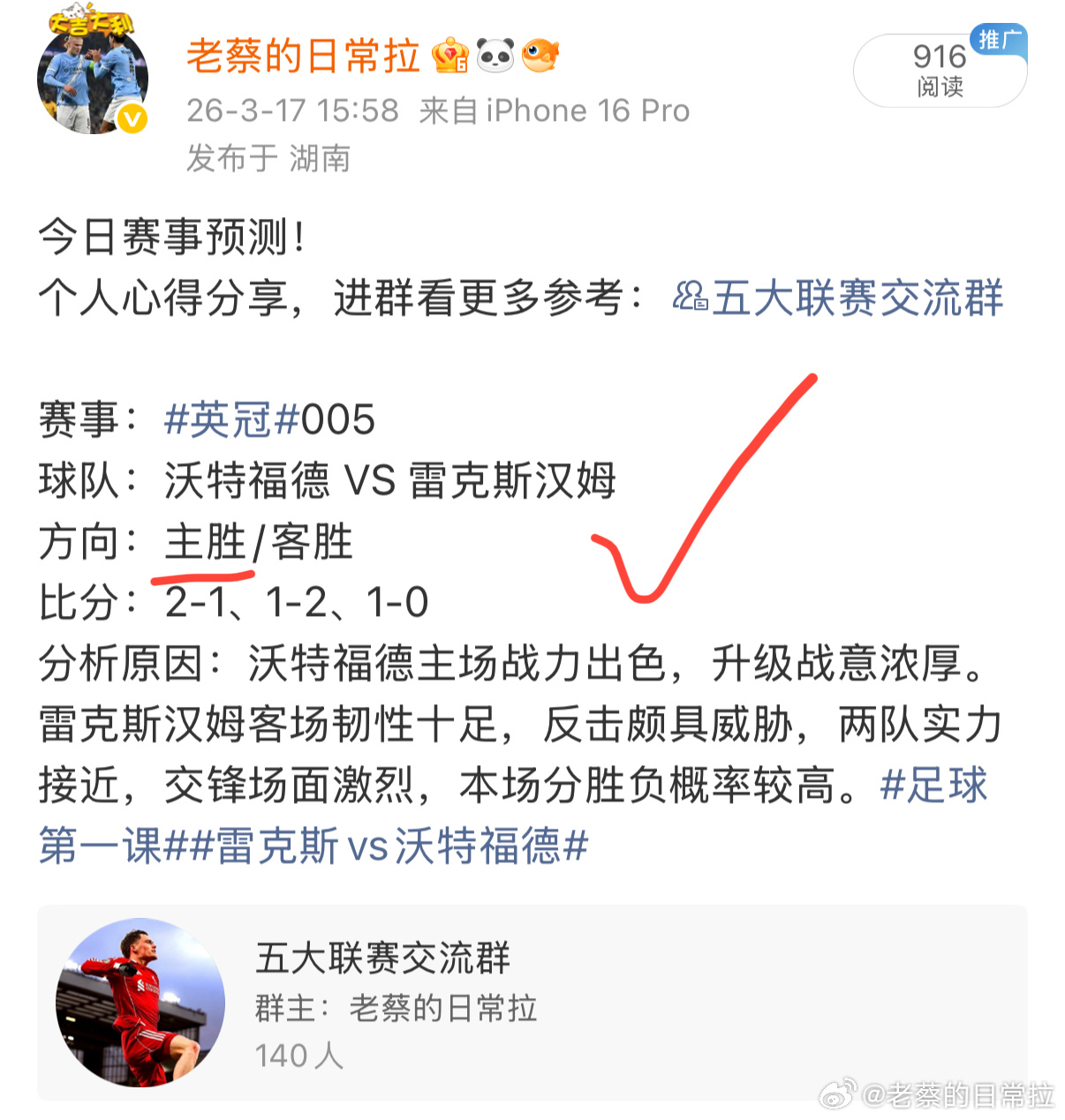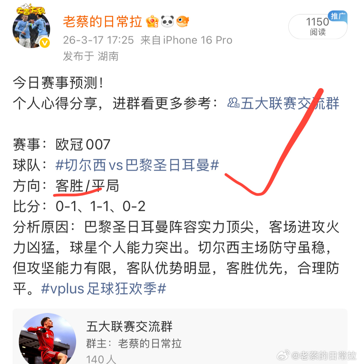 好状态持续在线,每天准时更新,一起享受比赛。内部方案分享〈五大联赛交流群〉每日足