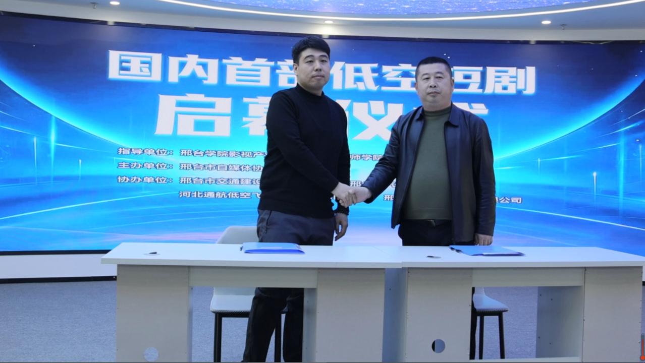 活动最后,邢台学院影视产业学院执行院长孔维广和邢台市自媒体低空经济融媒委员会主任王辉进行国内首部"低空主题"微短剧合作项目正式签约,标志着邢台探索"红色文化+低空经济+影视教育"融合发展迈出实质性步伐。该项目将依托河北通航的专业能力,整合学院创作资源与协会传播渠道,以"太行泉城、美丽邢台"为底色,打造具有全国影响力的现象级作品。