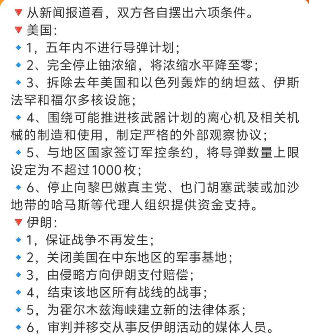 美国和伊朗分别对停战提出了六项条件,差距太大,各说各话,所以现在双方不具备谈判条件,还是继续打。 这就跟俄乌一样,谈判要进行,要么一方把另一方打败,要么双方都实在打不下去了。现在还没有出现任何一种情况,那就必然是继续在战场上见真章。
