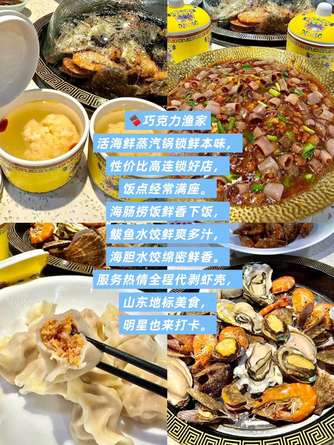 活海鲜蒸汽锅锁鲜本味,性价比高连锁好店,饭点经常满座。海肠捞饭鲜香下饭,鲅鱼水饺鲜爽多汁,海胆水饺绵密鲜香。服务热情全程代剥虾壳,山东地标美食,明星也来打卡。