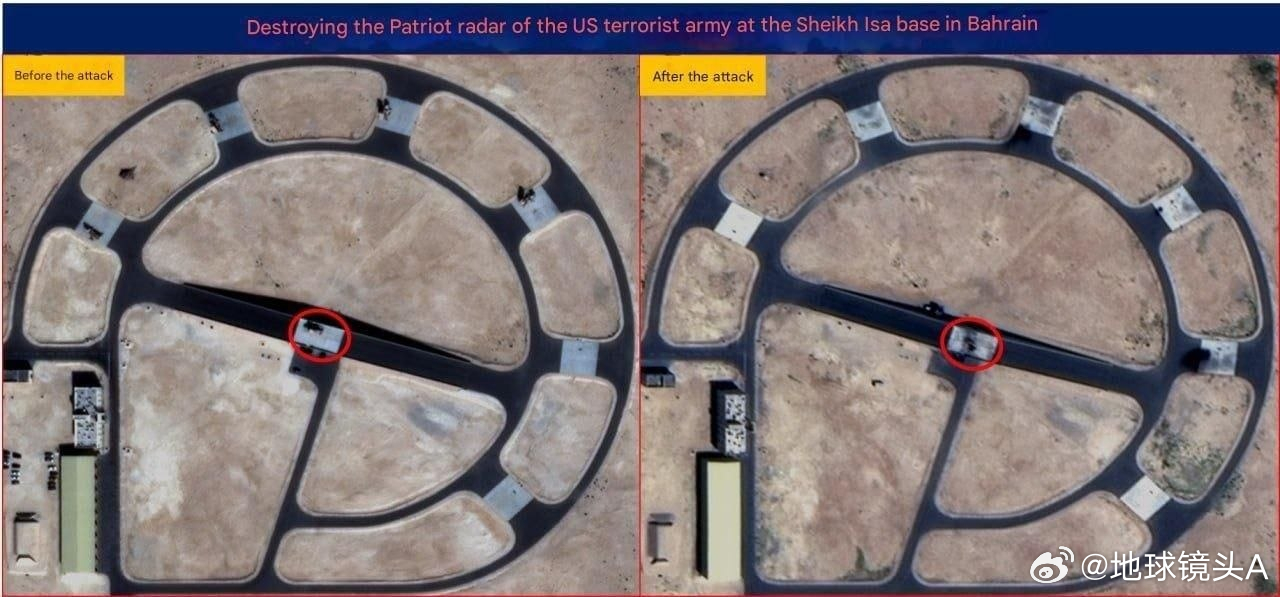 伊朗公布袭击美军基地前后对比照 革命卫队公布的卫星图像,显示位于巴林谢赫伊萨空军基地的两套美国雷达系统遭到伊朗精准打击:1,负责引导拦截导弹的AN/MPQ-65 “爱国者” 导弹连雷达被摧毁,2,位于巴林国际机场的 AN/TPS-75 预警雷达被摧毁