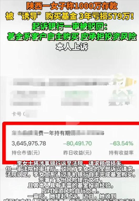 陕西咸阳,一女子手握1000万存款。某银行负责人郑某因存款任务未完成,求女子帮忙存入该行,承诺1年不取保本。女子到银行后,郑某用其手机操作,女子3年后查询发现,存款变成了购买基金,亏损579万。女子起诉,一审驳回诉求,她不甘心提起上诉。