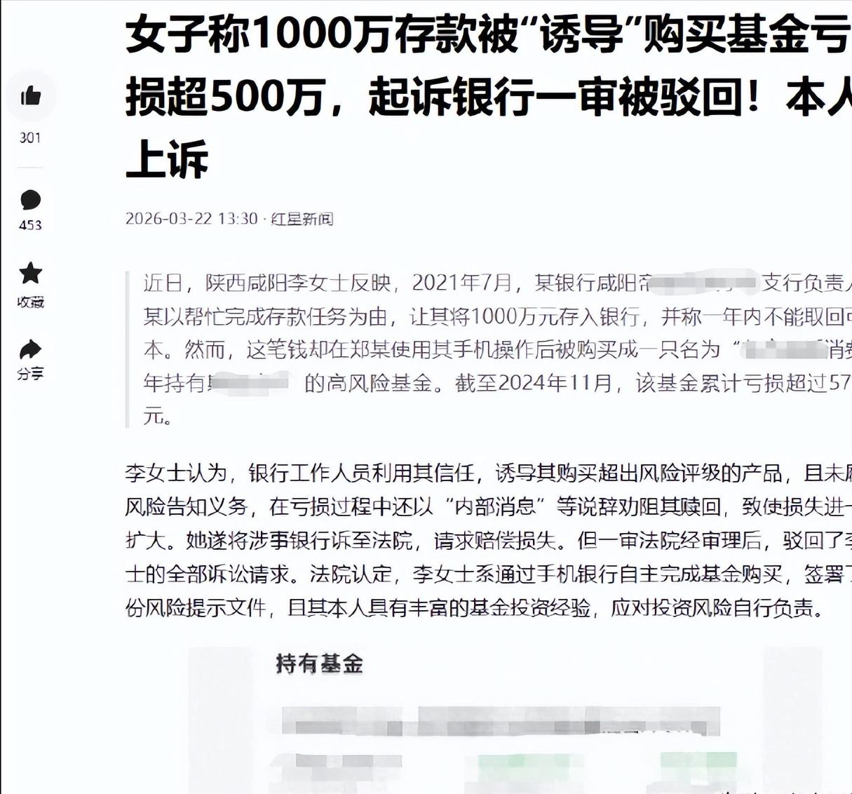 信源:红星新闻3-22 13:55 来自 微博视频号 已编辑【女子称1000万存款被“诱导”购买基金亏损超500万,起诉银行一审被驳回!本人上诉