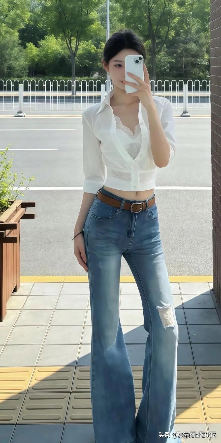 牛仔裤选复古微喇的,出片率超高。它和直筒裤不同,自带复古滤镜,高腰设计更是“身材作弊器”,能藏赘肉、修腿型。要是配直筒裤也不错,利落流畅,能藏住腿粗、腿不直的小瑕疵,搭配低跟单鞋,轻盈感十足。春天这么穿,时尚感轻松拿捏!