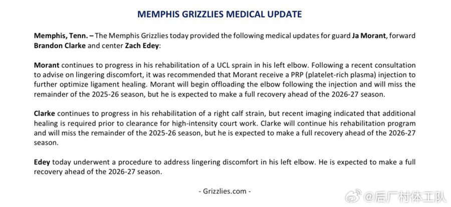 灰熊官宣莫兰特赛季报销 灰熊官方宣布莫兰特因为左肘伤势赛季报销,本赛季莫兰特仅为
