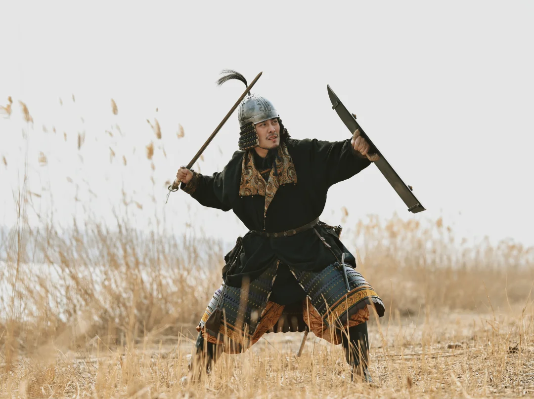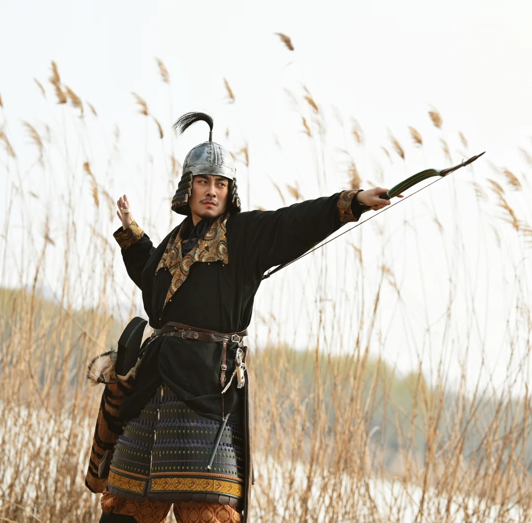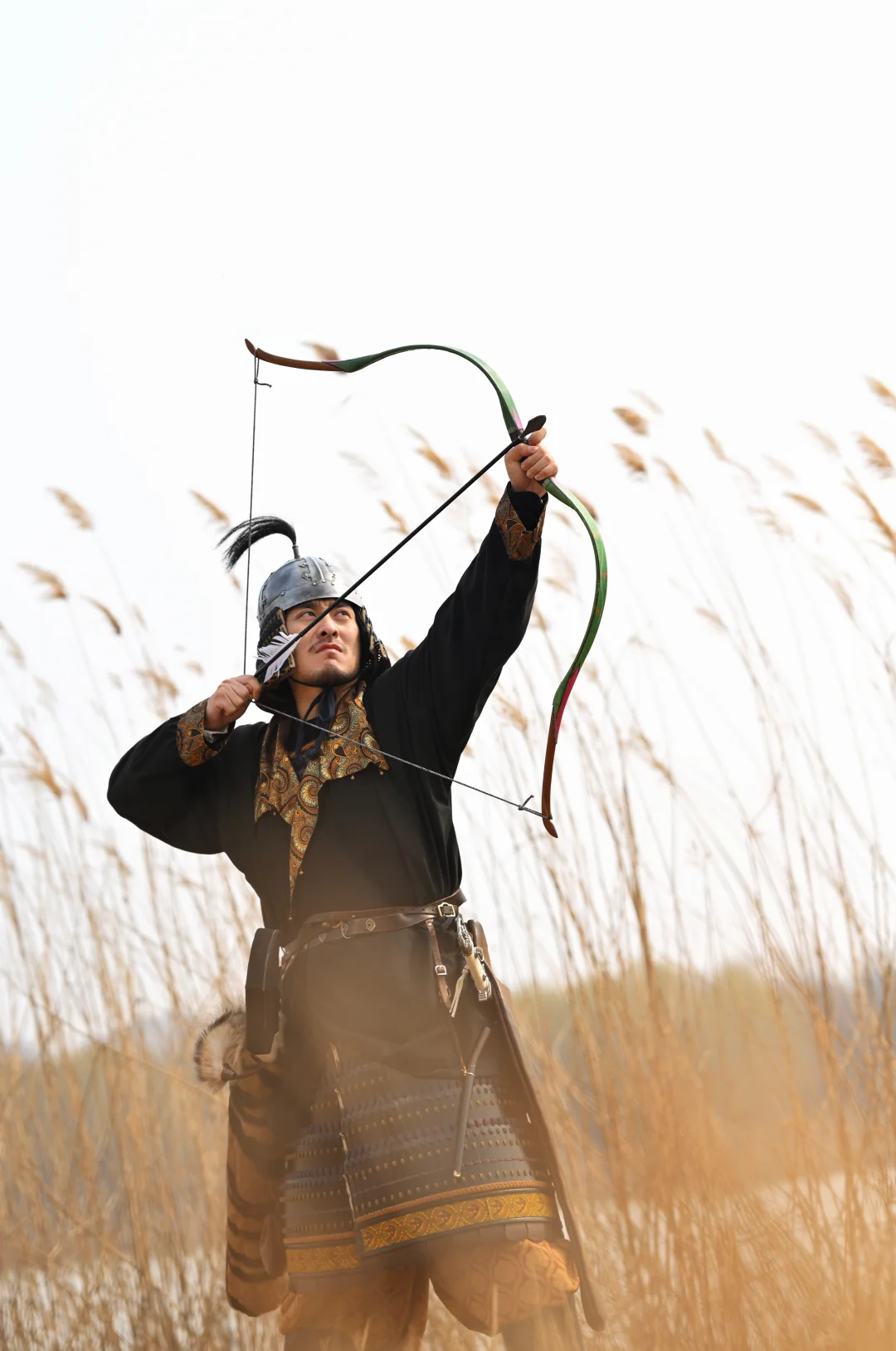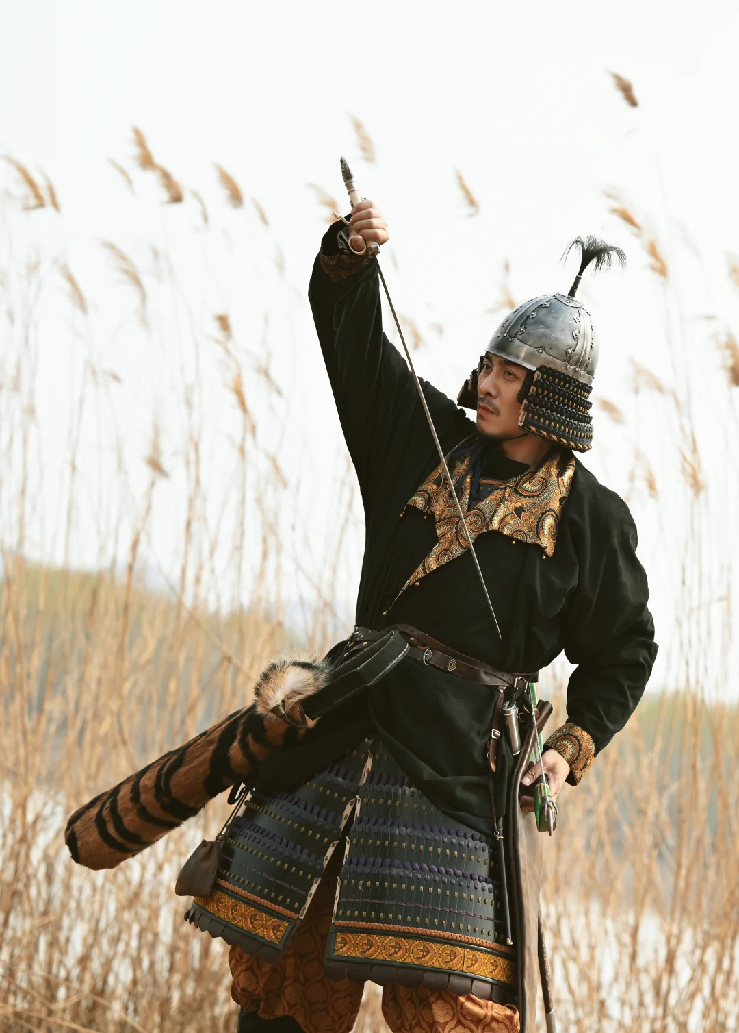本次造型沿用唐式直身甲经典配置,配盔、罩袍、刀盾与弓箭。因手持盾牌可有效防护上半身,同时为保证手臂活动灵活舒展,故未穿戴披膊。